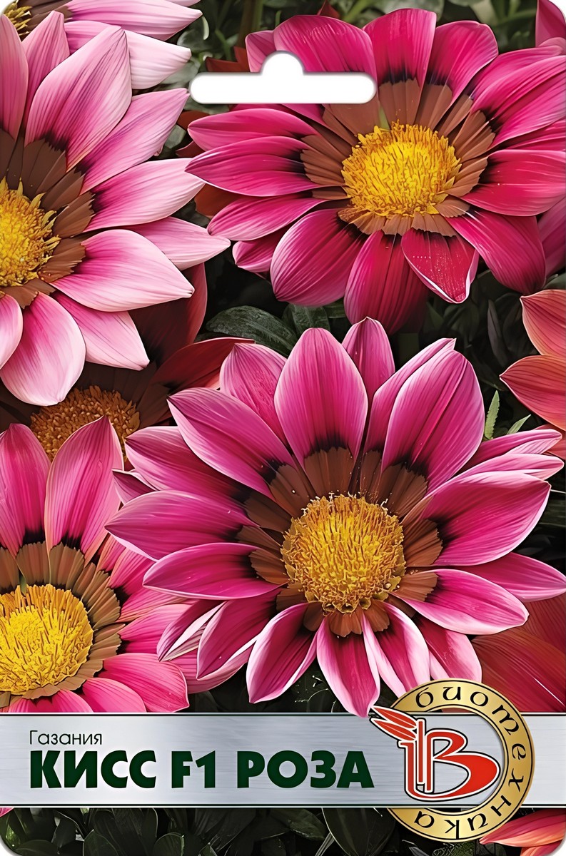 Газания Кисс Роза F1 — однолетнее растение высотой 20−25 см, густо усыпанное яркими цветами диаметром около 8 см. Лепестки раскрыты только в солнечную погоду. Период цветения — с июня до начала осени. Семена проращивают в феврале-марте, создавая условия, максимально приближенные к тепличным. Посадочный материал равномерно распределяют по поверхности субстрата, тонко присыпают влажным песком и укрывают пленкой. Окрепшие саженцы пикируют и по окончании весенних заморозков переносят в открытый грунт с ритмом 15−20 см. Линия Kiss зацветает на 2 недели раньше других сортов газании.