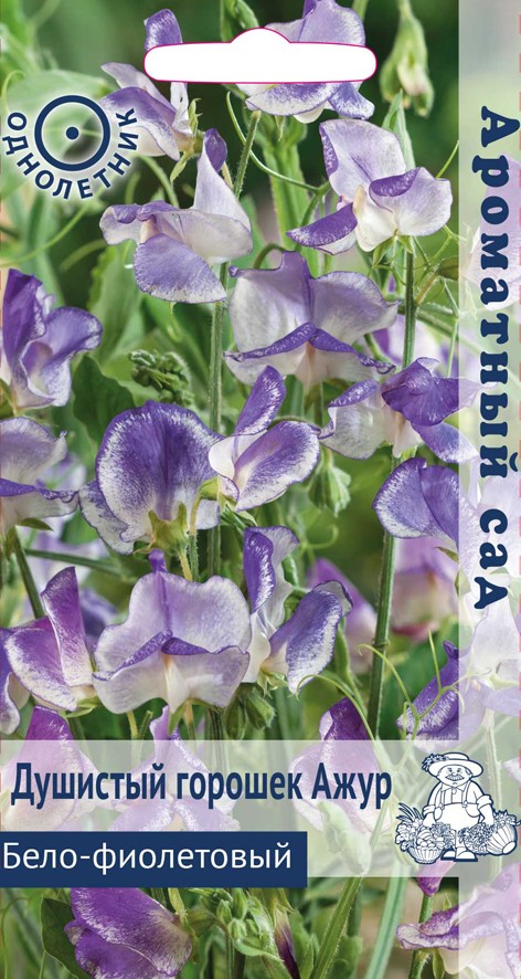 Душистый горошек Ажур Бело-Фиолетовый. Одна из самых ароматных серий душистого горошка. Лазающие крепкие, хорошо облиственные стебли до 200 см длиной. Цветоносы прочные, упругие, 25-45 см длиной. Цветки бело-фиолетовые, крупные, по 5-6 в кисти, с нежным сладким ароматом. Цветет с конца июня до заморозков. Легко переносит жаркие, засушливые условия. Используется для вертикального озеленения и на срезку. Растение предпочитает глубоко обработанные, плодородные почвы. Хорошо растет на открытых солнечных местах. Регулярный полив и подкормки способствуют обильному и продолжительному цветению. Размножают посевом семян в открытый грунт в мае, предварительно замоченными в теплой воде в течение 24 часов. Глубина заделки семян 0,5-1 см. При температуре почвы +18°C всходы появляются через 6-10 дней. Расстояние между растениями 15-30 см. Когда растение достигнет высоты 10 см, верхушку побега прищипывают, ставят опоры.