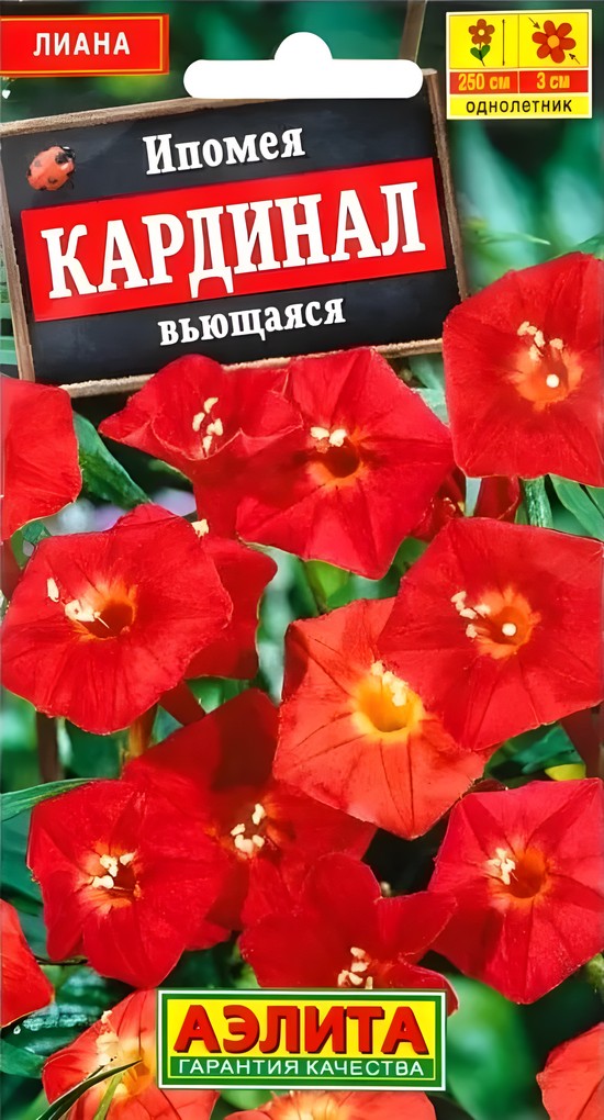 Изящная быстрорастущая однолетняя лиана. Растение способно активно взбираться вверх по любой опоре на высоту более 250 см. Кружевная листва очень декоративна, а в период цветения покрывается ярко-красными мелкими цветками, что делает растение очень эффектным и потрясающе красивым. Ипомея Кардинал вьющаяся используется для вертикального озеленения в саду и на балконах.