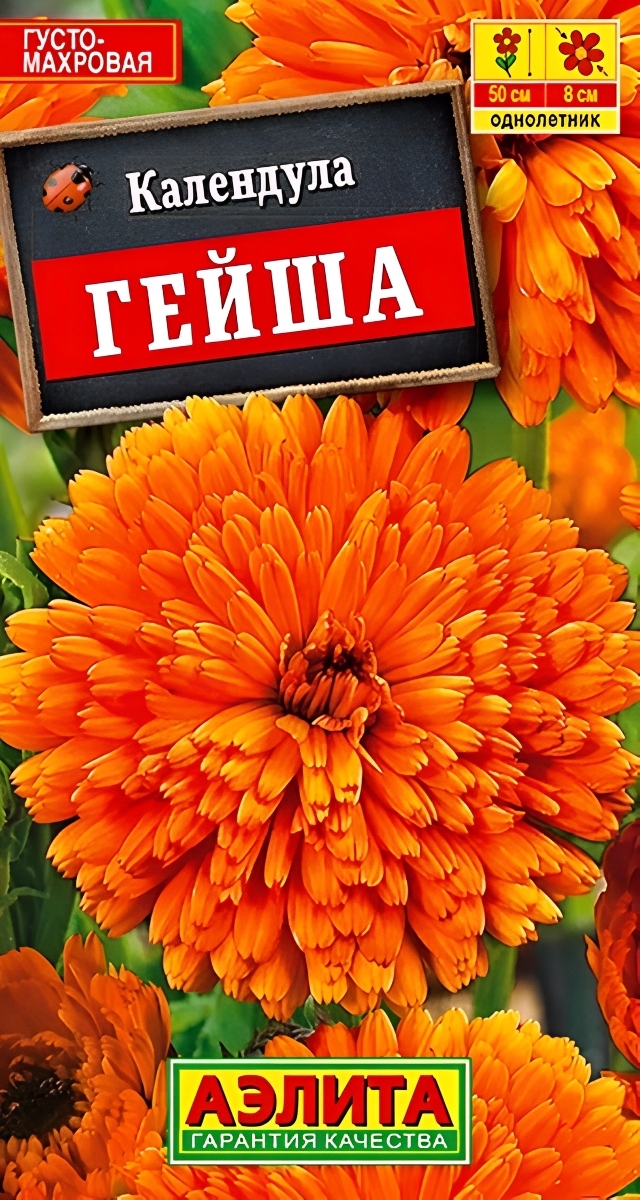 Появление в Вашем саду этой крупноцветковой махровой календулы не пройдет незамеченными. В ней все излучает энергию и жизнь: и яркие, очень крупные соцветия, и пышная листва. Прекрасно смотрится в больших массивах, бордюрах. Гейша дает превосходную срезку для букетов (не теряет декоративность 1-2 недели). Посев в открытый грунт в мае, в рядки с междурядьями 20 см, с последующим прореживанием всходов на расстоянии 20 см между растениями. Цветение наступает в июле.