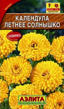Относится к сортотипу Пацифик. Популярное однолетнее растение из семейства Астровых. Обладает ценными лекарственными и фитосанитарными свойствами. Растение сильноветвистое, прямостоячее, высотой 50-60 см, с ланцетными листьями. Соцветия густомахровые, желтой окраски. Цветение обильное и продолжительное, особенно при удалении отцветших соцветий, длится с июня по сентябрь. Календула светолюбива и предпочитает легкие почвы, холодостойка - выдерживает до -5°C. Чаще всего календулу выращивают прямым посевом в грунт весной или под зиму. Всходы появляются через 7-10 дней. Позднее растения прореживают, оставляя расстояние в 20 см. Зацветает через 50-60 дней после посева. Для получения более раннего цветения выращивают календулу через рассаду, высевая в горшки в апреле. Широко используется для оформления участка и получения срезки.