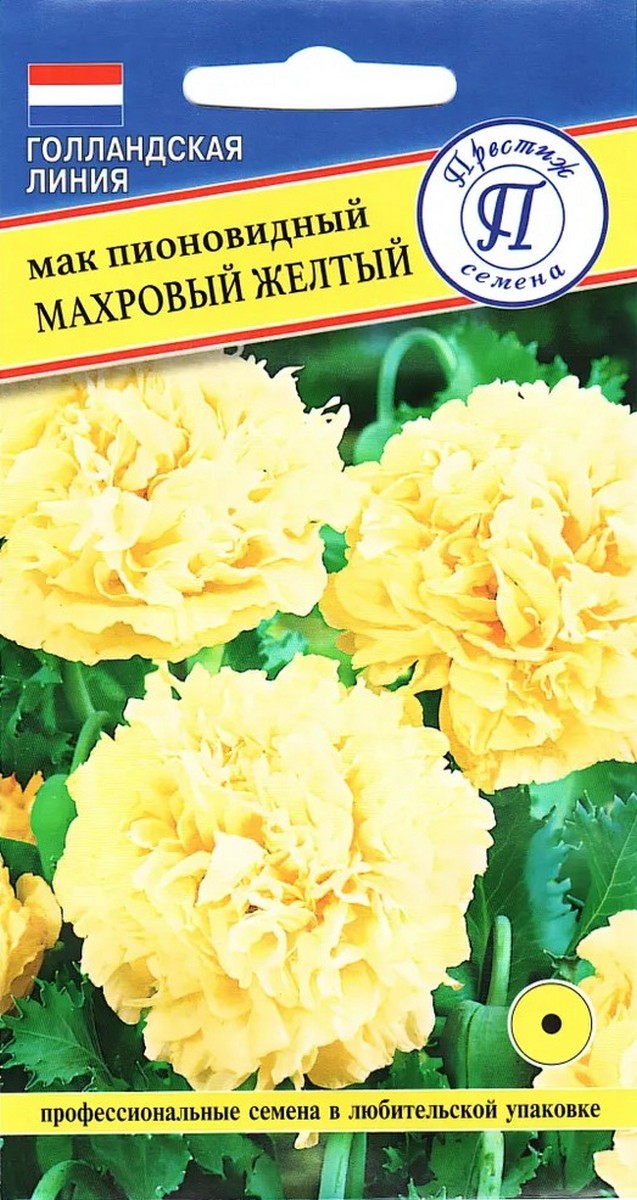 Мак Махровый желтый - однолетнее травянистое неприхотливое, засухоустойчивое растение высотой до 90 см голландской линии, с периодом цветения июнь – июль и продолжительностью до 30 дней. Используется для газонов, клумб, срезки. Верхушки высоких слабо облиственных цветоносов украшают одиночные крупные пионовидные пушистые цветки нежнейшего цвета и приятного аромата. После отцветания образуется плод коробочка. Посев мелких семян можно производить под зиму (октябрь) или ранней весной сразу после схода снега. Его проводят по поверхности в легкие рыхлые почвы, не заглубляя, в рядки на расстоянии 10 см, чтобы не прореживать всходы, так как пересадки переносит плохо. Повторные посевы через 2 - 3 недели обеспечат непрерывное пышное цветение. Очень любит солнце, но может расти и в небольшой полутени.