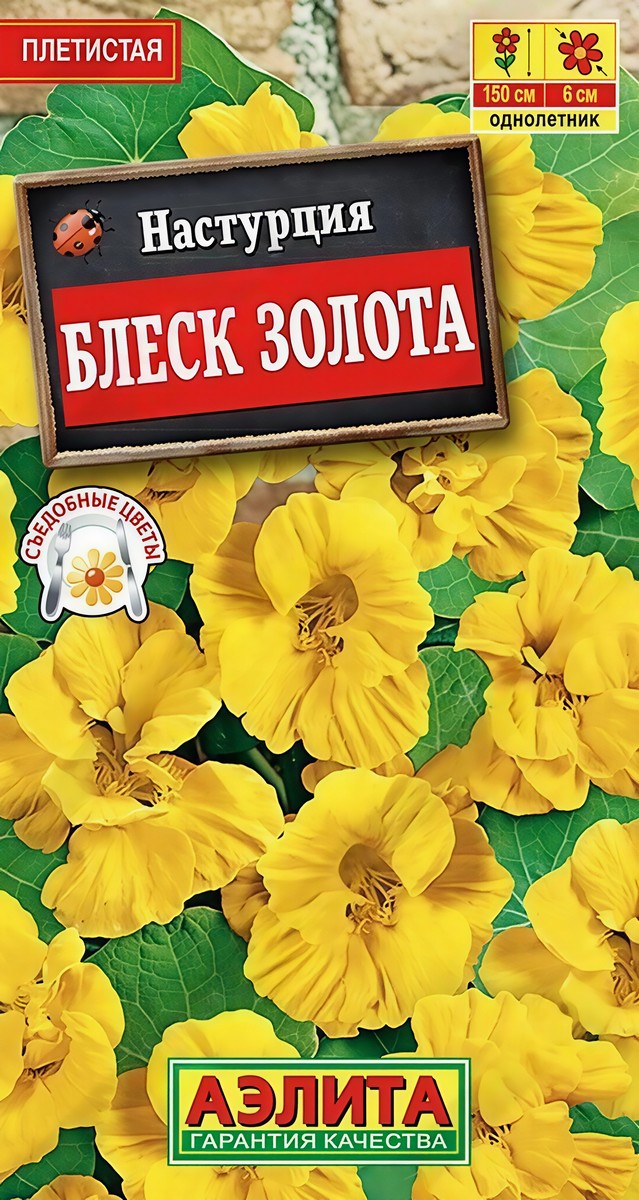 Красивая вьющаяся настурция из серии гибридов GLEAM (Блеск). Формирует хорошо облиственные побеги длиной около 150 см с эффектными махровыми цветками диаметром 5-6 см. Цветки ароматные. Выращивается на опорах, по которым необходимо направлять плети, или в ампельной культуре. В цветниках растет как почвопокровное растение, приобретая стелющуюся форму. Растения теплолюбивые, обильно цветут до первых заморозков. Предпочитают солнечное местоположение и легкие, дренированные почвы среднего плодородия. На богатых почвах «жируют», наращивают зеленую массу в ущерб цветению. Отзывчивы на подкормки фосфорно-калийными удобрениями.