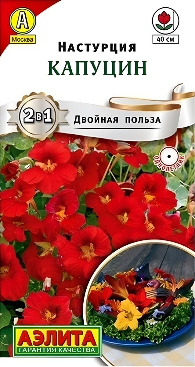 Сорт с ярко-красными цветками, которые эффектно выделяются на фоне темно-зеленой листвы. Куст низкорослый, крепкий, с большим количеством побегов. Высота* взрослого растения в открытом грунте до 40 см. Цветы, диаметром 5-7 см, располагаются над листвой. Растения используют для цветников, бордюров, вазонов и кашпо. Все части, кроме корней, съедобны – цветами украшают салаты, листья добавляют в холодные закуски. *Высота и декоративность растений зависят от условий и освещенности.