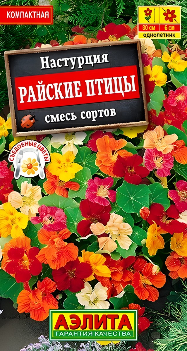 Разноцветная смесь кустовой настурции с декоративной мраморной листвой. Растения быстро растут и развиваются, формируя аккуратный кустик высотой 30-40 см, пышно украшенный яркими крупными цветками Ø 5-6 см. С июля и до заморозков настурция будет радовать обильным и продолжительным цветением и станет настоящим украшением различных солнечных уголков сада. Смесь подойдет для оформления балконных ящиков, садовых клумб и вазонов.