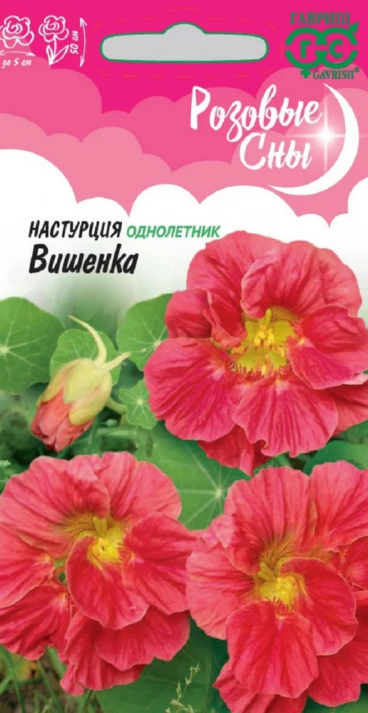 Сорт с ярко-красными цветками, которые эффектно выделяются на фоне темно-зеленой листвы. Куст низкорослый, крепкий, с большим количеством побегов. Высота* взрослого растения в открытом грунте до 40 см. Цветы, диаметром 5-7 см, располагаются над листвой. Растения используют для цветников, бордюров, вазонов и кашпо. Все части, кроме корней, съедобны – цветами украшают салаты, листья добавляют в холодные закуски. *Высота и декоративность растений зависят от условий и освещенности.
