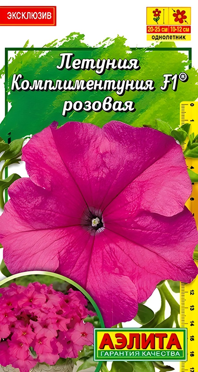 Комплиментуния – стильное, эффектное и очень изящное растение. Это романтичный, практичный выбор и комплимент на языке цветов. Комплиментуния – эксклюзивный гибрид (новая петуния) с крупными цветками и супер-обильным цветением. Украсит любой цветник и будет долго дарить радость и восхищение. Благодаря наличию гена мужской стерильности семян не завязывает, направляя всю энергию на формирование новых цветков. Форма растений кустовая, со склонностью к трейлингу: ширина больше высоты. Высота 20-25 см, ширина 40-50 см. Быстро разрастается. Растения устойчивы к болезням, выдерживают дождливую и ветреную погоду, переносят кратковременные заморозки до –5 С и экстремальную жару до +40 С без потери декоративности.