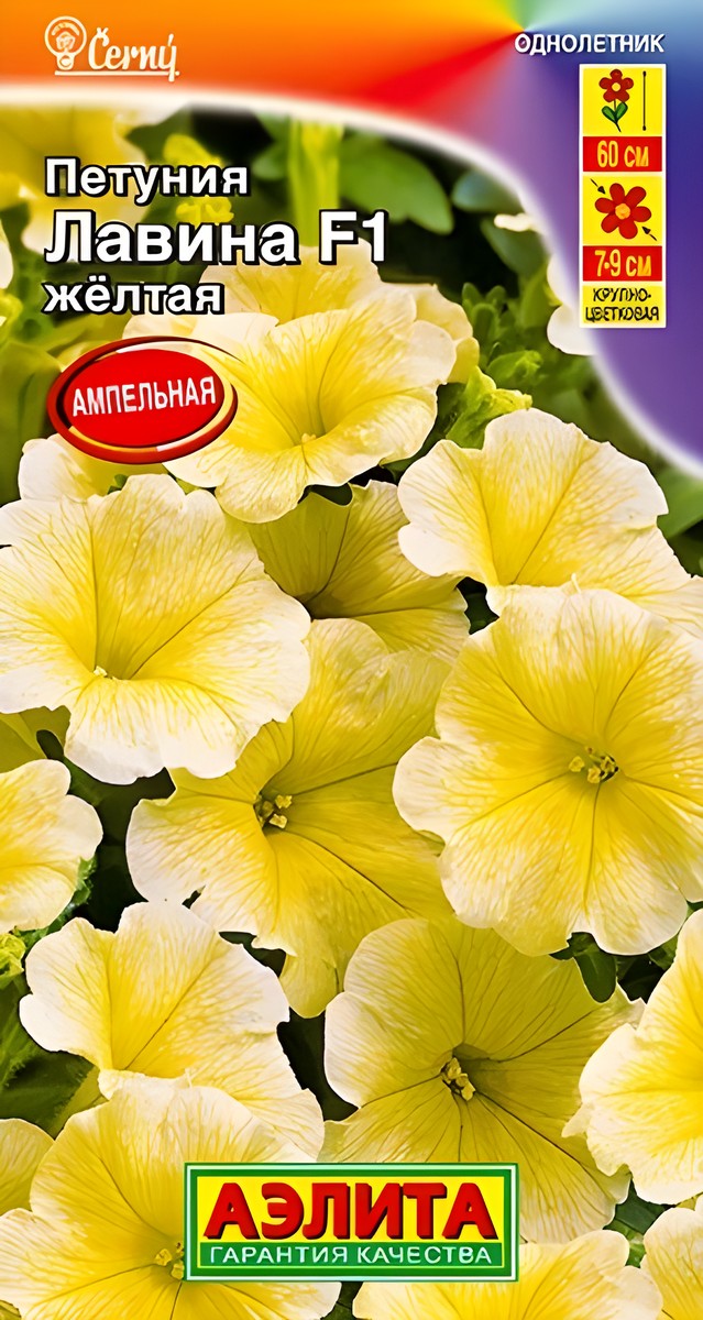 Раннецветущая петуния. Почти неубиваема: хорошо переносит заморозки до -5°С и жару до +40°С, не прекращает рост при низких температурах, быстро восстанавливается после непогоды, устойчива к серой гнили. Не требует удаления увядших цветков. Формирует обильно цветущий куст с длиной плети до 90 см! Цветки нежно-желтые, более интенсивного цвета ближе к центру, с лаймовой серединкой. Цветение непрерывное и продолжительное. Подходит для выращивания в грунте на клумбах в качестве почвопокровного растения, в подвесных корзинах, вазонах. Длина плети: 70-90 см. Диаметр цветка: 6-7 см. Время посева на рассаду: январь-март. Время высадки в открытый грунт: май-июнь. Посадочное расстояние: 40-50 см. Период цветения: май-сентябрь. Уход: рекомендуется провести прищипывание побегов для стимуляции ветвления на 4-5 неделе. Первую подкормку проводят через 10-14 дней от появления всходов комплексным минеральным удобрением, далее – 1 раз в 7 дней. . Внимание! Семена дражированные, оболочку не разрушать, она растворяется при поливе