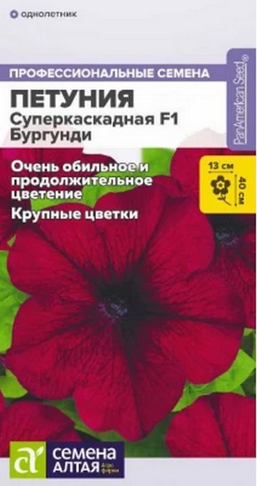 Петуния каскадного типа с невероятно крупными цветками винной окраски. Растение хорошо ветвится, образуя мощный декоративный кустик. Можно выращивать в вазонах, контейнерных, использовать в массовых и одиночных посадках на клумбах. Цветение яркое и продолжительное: с весны до конца лета. Высота растения: 25-40 см. Диаметр цветка: 10-13 см. Время посева на рассаду: февраль-март. Время высадки в открытый грунт: май-июнь. Посадочное расстояние: 30-40 см. Период цветения: май-август. Внимание! Семена дражированные, оболочку не разрушать, она растворяется при поливе!