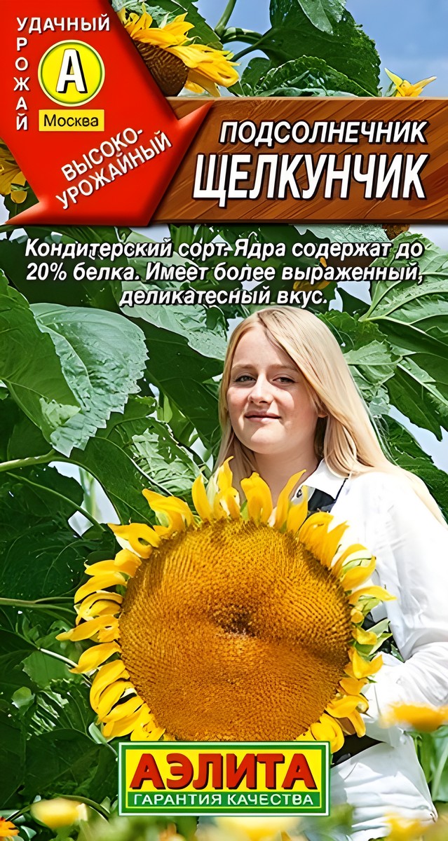 Высокоурожайный грызовой сорт из сегмента кондитерских. Среднеранний, формирует урожай за 85-90 дней. Растения высокие – 190-210 см с большими, плоскими или слегка выпуклыми корзинками. Цветение и созревание дружное. Семена крупные (масса 1000 семянок превышает 120 г), овально-удлиненные, черные с серыми краевыми полосами, хорошо выполненные (массовая доля ядра 60-65%). Ядра содержат до 20% белка – значительно выше, чем у масличных сортов. Традиционное российское лакомство имеет более выраженный, деликатесный вкус. Растения обладают высокими медоносными и декоративными качествами. Посев семян в открытый грунт проводят в третьей декаде мая, когда почва прогреется до 10-12°С, на глубину 2-3 см. Подсолнечник требует плодородных, дренированных, нейтральных по кислотности почв и солнечного местоположения. Сорт отзывчив на внесение минеральных удобрений.