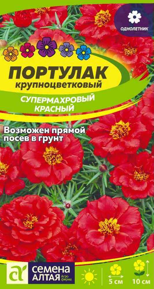 Великолепное низкорослое ползучее растение высотой около 10 см с мясистыми игловидными листиками и стеблями сизовато-зеленого цвета, иногда с багровым оттенком. Цепляясь за грунт, полностью покрывает участок или клумбу, образуя сплошной яркий ковер. Изюминка растения – махровые цветки ярко-красные окраски, напоминающие миниатюрную розу или пион. Выращивают посевом семян на рассаду в первой декаде апреля. Для прорастания семенам необходим свет, поэтому сеют поверхностно, лишь слегка вдавливая их в субстрат. В открытый грунт рассаду высаживают, когда минует угроза заморозков. Посадочное расстояние 25-30 см. Возможен прямой посев семян в грунт в первой половине мая, тогда молодым всходам может потребоваться дополнительная защита от заморозков или укрытие от прямого солнца, пока они не подрастут. Цветение непрерывное с июня до заморозков.