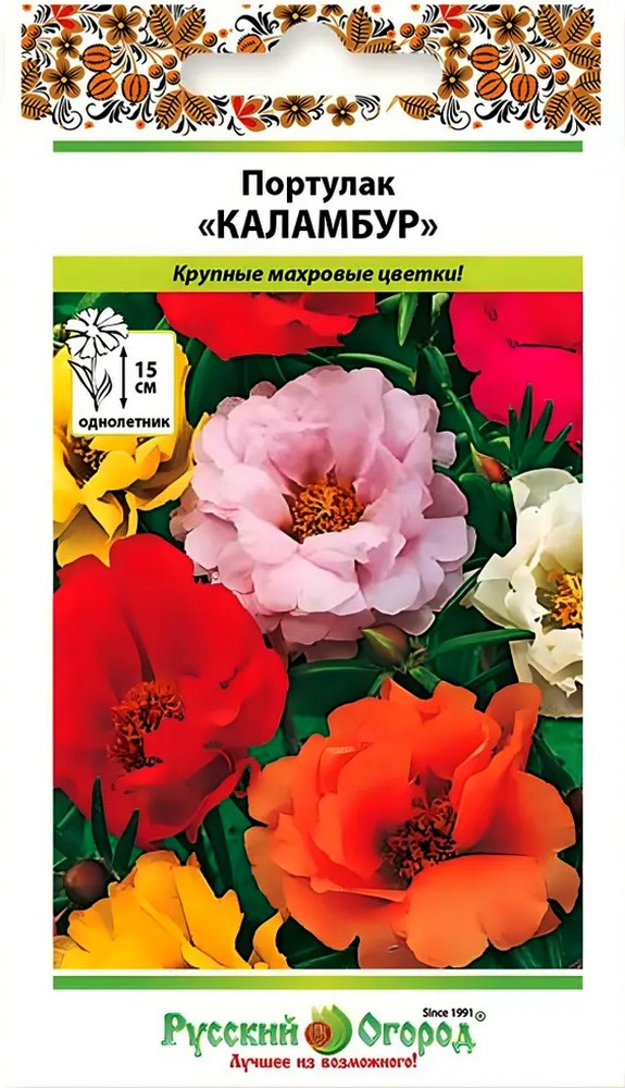 Портулак Каламбур – яркая смесь праздничных махровых и полумахровых цветов, диаметром до 4 см! Прекрасный вариант для создания ковровых цветников, при этом, если вам необходима совсем небольшая клумба – подойдет только эта смесь! Цвета яркие, насыщенные, сказочно контрастируют друг с другом на солнце.Портулак Каламбур вырастает всего до 15 см в высоту. Его следует высаживать исключительно на открытые солнечные места, иначе цветение будет не столь обильным. Также, второй пункт при выращивании портулака – регулярный полив, не ежедневный, но всё-таки засуху лучше не провоцировать. В остальном же портулак не обременит вас на лишние хлопоты: ему не нужно делать обрезку, можно не подкармливать удобрениями. Он растёт и на бедных, и на плодородных почвах, правда не очень жалует кислые (поэтому добавляйте в последние песок).