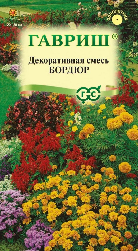 Яркая низкорослая бордюрная смесь для посадок вдоль дорожек, окаймления цветников и обрамления газонов. Контрастное сочетание белых, желтых, пурпурных, оранжевых оттенков создает эффект нарядного ковра. Сорта низких или стелющихся растений (алиссум, низкие астры и бархатцы, календула, вьюнки, диморфотека, эшшольция, иберис, львиный зев и др.) имеют плотный кустик, выровнены по высоте, обильно и дружно цветут в течение всего сезона. Особенностью смеси являются неприхотливость, засухоустойчивость. Растения светолюбивые, предпочитают плодородные, дренированные, умеренно влажные почвы. На рассаду высевается в апреле, высаживается в открытый грунт после всех заморозков. В открытый грунт семена высевают в апреле-начале мая. Уход за бордюрами заключается в рыхлении почвы, поливке и стрижке, которая дает возможность придать бордюру желательную форму. Для более пышного цветения верхушки растений прищипывают в раннем возрасте.