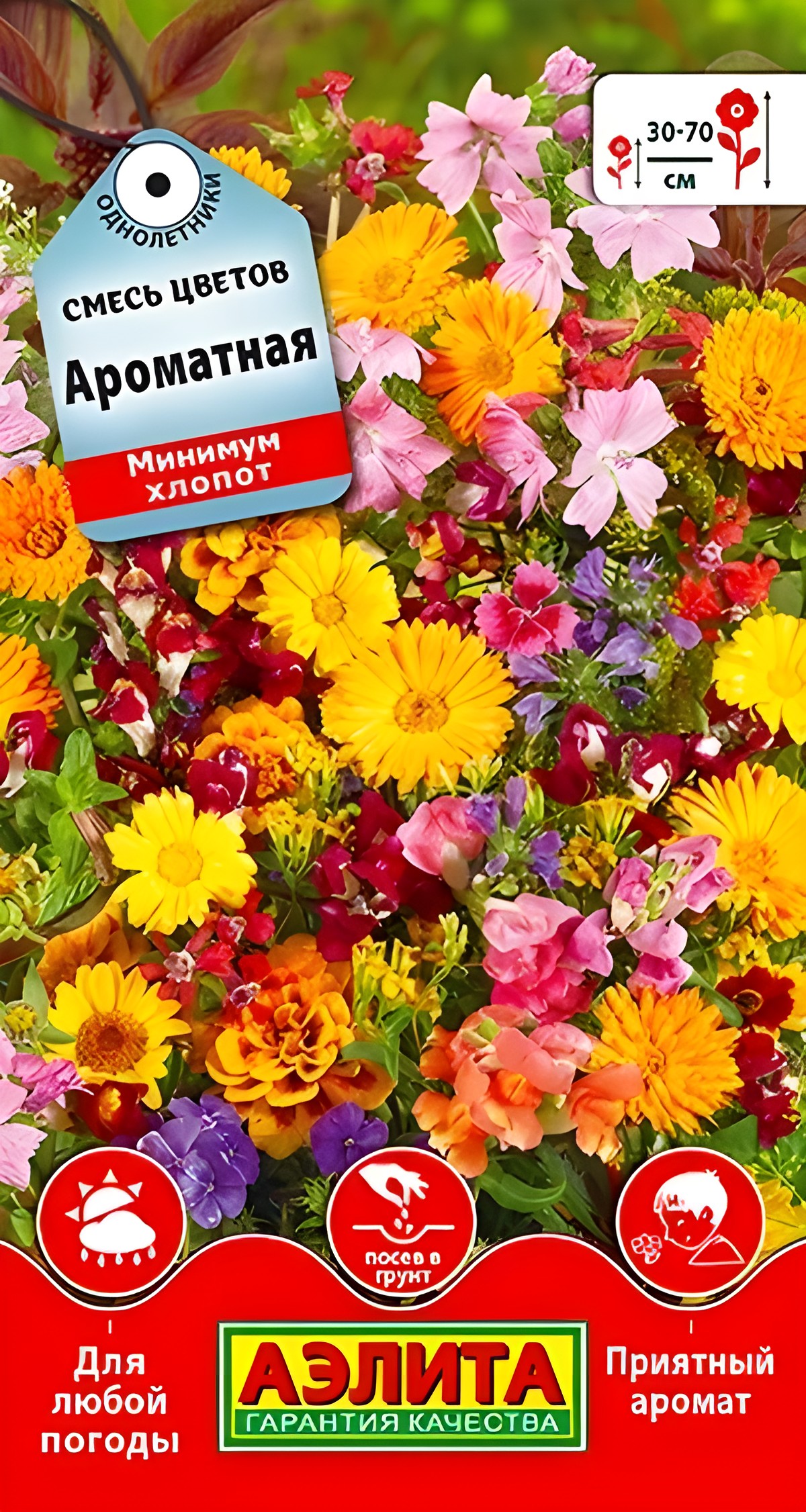 Ароматная смесь неприхотливых однолетников – настоящая находка для садовода. Минимум затрат и хлопот – семена всех любимых цветов в одной упаковке. Гармоничное сочетание оттенков, нежный запах соцветий, последовательное цветение. Состав смеси: гвоздика садовая, горошек душистый, календула, левкой, мальва, табак крылатый, флокс друммонда и другие.