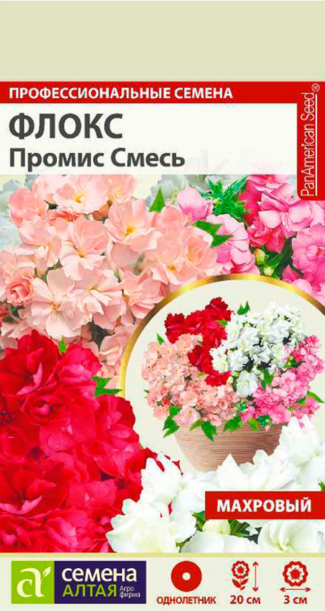 Невысокое, очень компактное растение. Соцветия состоят из махровых и полумахровых душистых цветков диаметром до 3 см, которые не выгорают на солнце. Флоксы серии Промис в течение сезона стабильно сохраняют выравненность и однородность. Отлично смотрятся в качестве бордюрного растения, широко используются на переднем плане цветников, в качестве контейнерного растения на балконах и подоконниках. На рассаду семена высевают с конца марта. В открытый грунт рассаду высаживают в конце мая – начале июня, когда минует угроза возвратных заморозков. Посадочный интервал 25-30 см. Можно выращивать посевом семян в открытый грунт в самые ранние сроки. Цветение начинается в июне-июле и продолжается до заморозков.