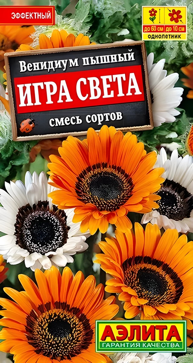 Смесь белоснежных и мандариновых цветков редкого растения из Южной Африки. Венидиум – очень красивый однолетник высотой до 60 см, с густой листвой и крупны ми цветками, похожими на ромашки, до 10 см. Цветет очень ярко и обильно июня по октябрь. Растение отлично подходит для цветников, альпийских горок, вазонов и на срезку.