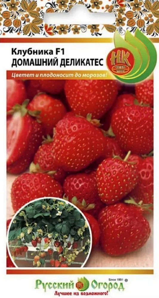 Ягоды земляники сорта Домашний деликатес округлые, в среднем 3 сантиметра в диаметре. Цвет плодов характерный для земляники - насыщенный красный. Ягоды имеют великолепные вкусовые качества, выгодно отличающие сорт на фоне других видов данного растения. Плодоношение F1 Домашний деликатес, благодаря его ремонтантным особенностям, происходит вплоть до первых заморозков, а возобновление вегетационного периода начинается вместе с сокодвижением ранней весной при средней положительной температуре 5-7 градусов.F1 Домашний деликатес имеет цветоносы удлинённого размера, что позволяет растению выносить ягоды наружу кроны, облегчая тем самым их сбор. Кроме того, такая земляника облает хорошей зимостойкостью и высокой устойчивостью к мучнистой росе и грибковым заболеваниям.F1 Домашний деликатес имеет ещё и декоративное предназначение. Растения хорошо приживаются в различных подвесных ёмкостях и могут служить великолепным украшением балконов, открытых беседок, террас и прочих открытых мест.