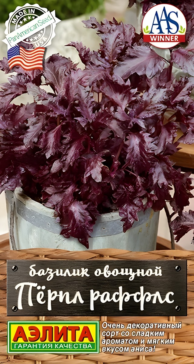 Известный своей красотой, вкусом и легкостью выращивания сорт американской селекции от компании PanAmerican Seed. Победитель All-America Selections. Период от всходов до цветения – 45-50 дней. Растение высотой 45-60 см, с большими блестящими листьями. Они обладают сладким ароматом с мягким вкусом аниса. Базилик Пёрпл Раффлс очень декоративен и будет прекрасно выглядеть в саду и контейнерах. Подходит для употребления в свежем виде, сушки и консервирования. Урожайность зелени – 2-3 кг/м2.