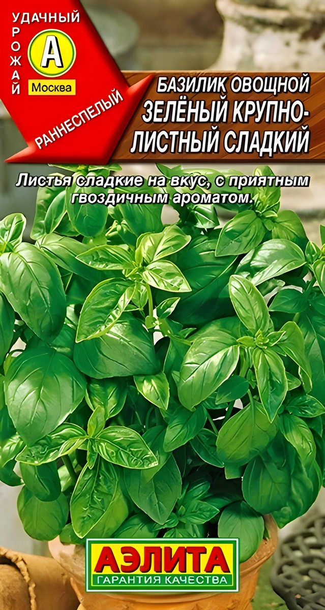 Раннеспелый крупнолистный сорт базилика с насыщенным гвоздичным ароматом. Незаменим в кулинарии в свежем и сушеном виде. В сухих специях вкус и аромат сохраняются, а соусы с добавлением молодых листочков навсегда покорят искушенного гурмана. Растения образуют плотные, крепкие, компактные кустики с большим количеством побегов и листьев. В период начала потребительской годности высота растений около 30-35 см. Срезку зелени начинают до начала цветения, через 40-50 дней от всходов. Удаление цветоносов продлевает период отдачи зеленой массы. В средней полосе выращивают через рассаду, в южных регионах – прямым посевом семян в О/Г на глубину 1,5-2 см. Используют в пищу молодые побеги с листьями длиной 10-12 см. Их срезают несколько раз, не допуская цветения.