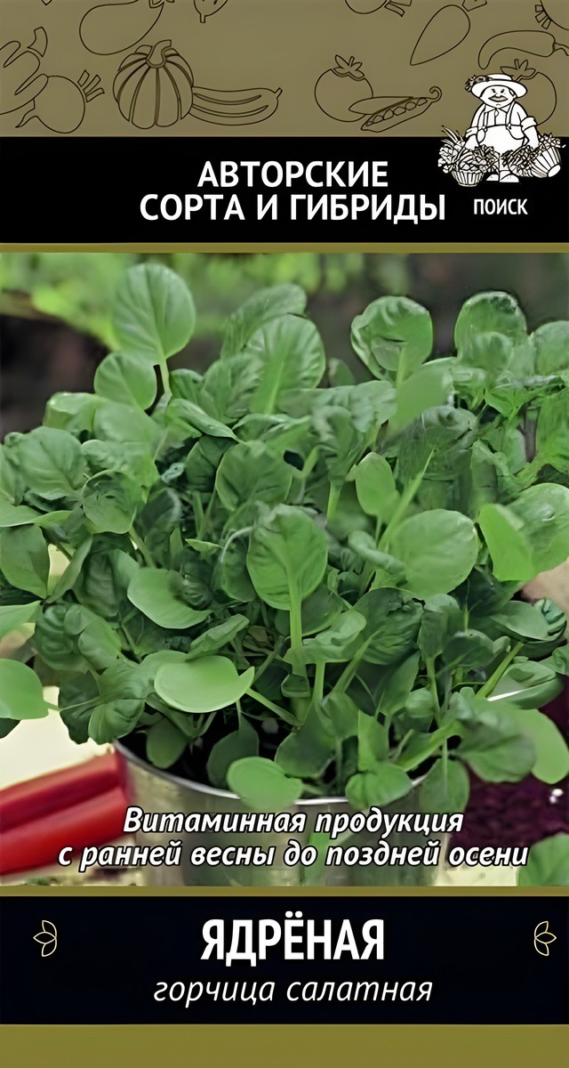 Раннеспелый сорт. Период от всходов до сбора урожая 28-30 дней. Розетка листьев крупная, прямостоячая, слегка раскидистая, диаметром 25-32 см. Листья светло-зелёные, крупные, с волнистыми зубчатыми краями, со слабоострым привкусом, напоминающим столовую горчицу. Масса растения 30-70 г. Устойчивость к стеблеванию. Посев горчицы проводят в ранние сроки с шириной междурядий 45 см. При температуре воздуха 18-20°С всходы появляются на 3-4 й день. Максимальная холодостойкость растения проявляется в фазу нарастания листьев. Хорошие результаты дают осенние посевы при условии достаточного качества влаги в почве. Для обеспечения конвейерного поступления зелени горчицу рекомендуется высевать в несколько сроков ( с интервалом 7-14 дней). Глубина посева семян -1-1,5 см, норма высева горчицы - 3 - 5 кг/га. После посева почву прикатывают. Урожайность: 2,8-3,3 кг/м2. Растения дают нежную витаминную продукцию с ранней весны до поздней осени. Используются в свежем виде в салатах.