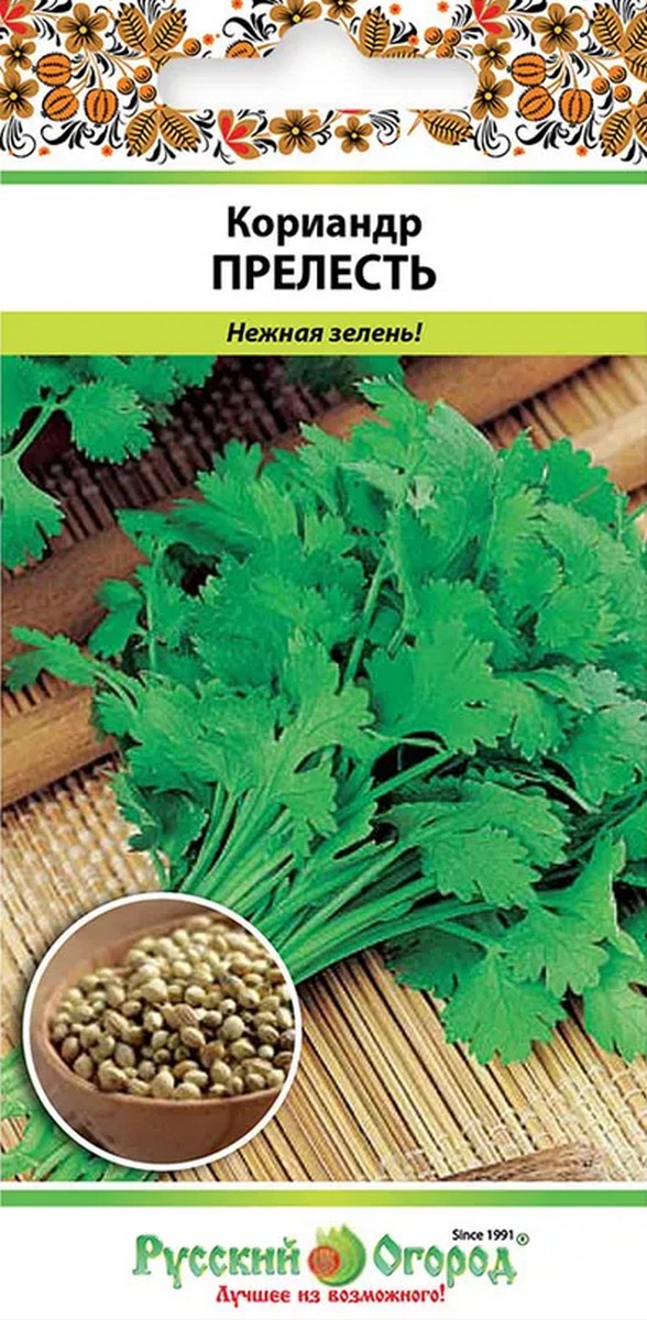 Среднеспелый (30–40 дней от всходов до уборки зелени), холодостойкий, устойчивый к полеганию сорт кориандра. Растение ветвистое высотой до 90 см. Листья темно-зеленые с ярким пряным ароматом. В кулинарии широко используются, зелень и семена кориандра, для приготовления салатов, пряных приправ, для ароматизации хлеба, кондитерских изделий и маринадов. В медицине применяется при простудных и желудочных заболеваниях, обладает желчегонными, болеутоляющими и ранозаживляющими свойствами. Отличный медонос. Высевают семена рано весной по схеме 10х20–30 см или под зиму. Для непрерывного сбора зелени посевы повторяют каждые 2–3 недели.