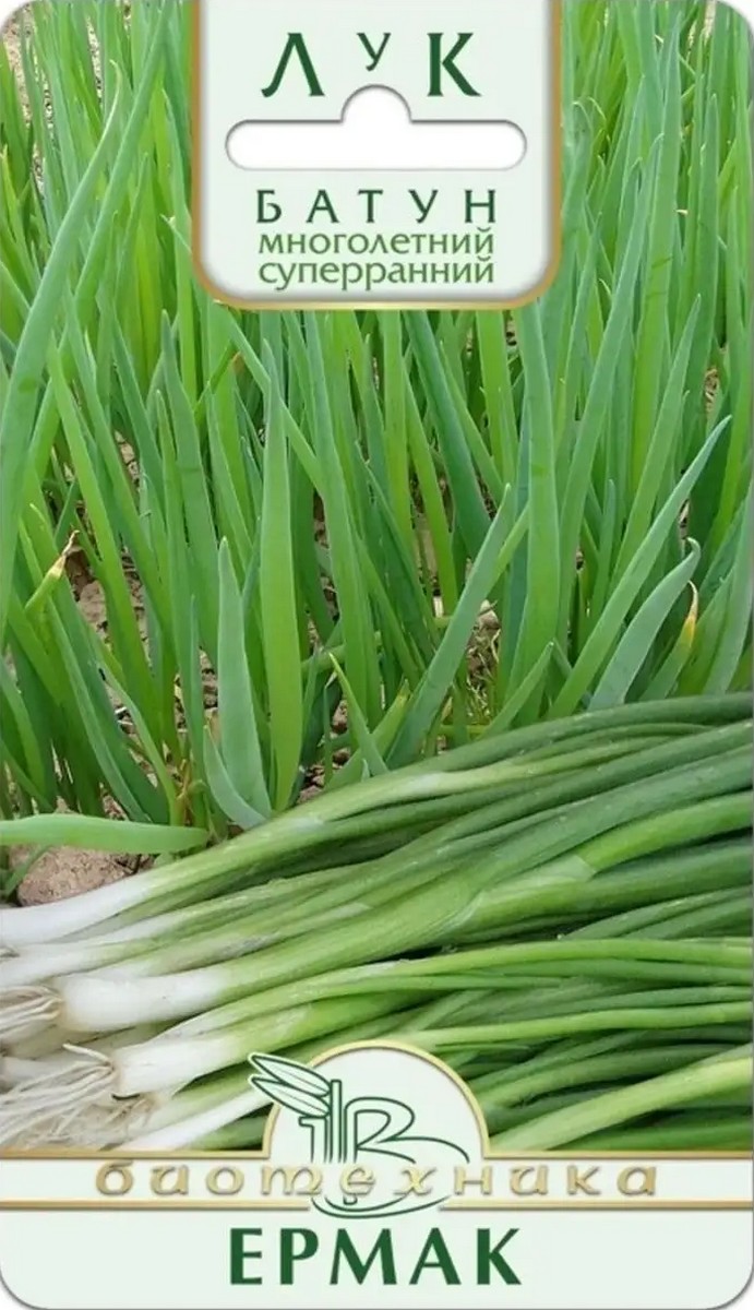 Очень ранний, с длительным периодом пригодности для срезки зелени.У сорта Ермак листья цилиндрические, дудчатые, более крупные, чем у лука репчатого, темно-зеленые со слабым восковым налетом.Вкус приятный, полуострый.При окучивании резаной соломой или опавшими листьями, формирует укороченную отбеленную “ногу”, улучшающую вкусовые качества растения.За сезон проводят 2-3 срезки. После срезки, желательно провести подкормку минеральным удобрением с преобладанием азота.На одном месте рекомендуется выращивать не дольше четырех лет, иначе значительно снижается урожай зелени.