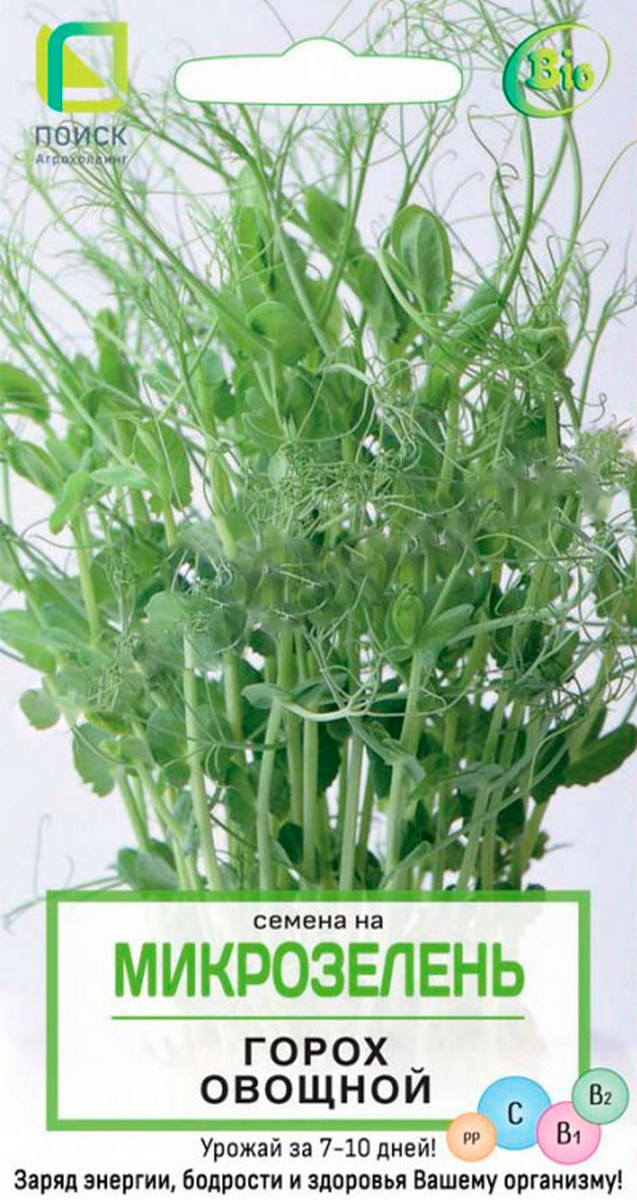 Нежная сочная микрозелень имеет вкус молодого горошка с легким оттенком ореха. В пищу используются листья, усики, стебли, как ингредиенты для салатов, так и в отваренной форме в овощных супах и в составе рагу. Ростки гороха содержат фосфор, витамины группы В, Е, С, РР, К, протеины. Способствуют снижению сахара в крови, выведению токсинов, росту и регенерации клеток, обладают противоопухолевой активностью. В состав входят семена гороха овощного Триумф.