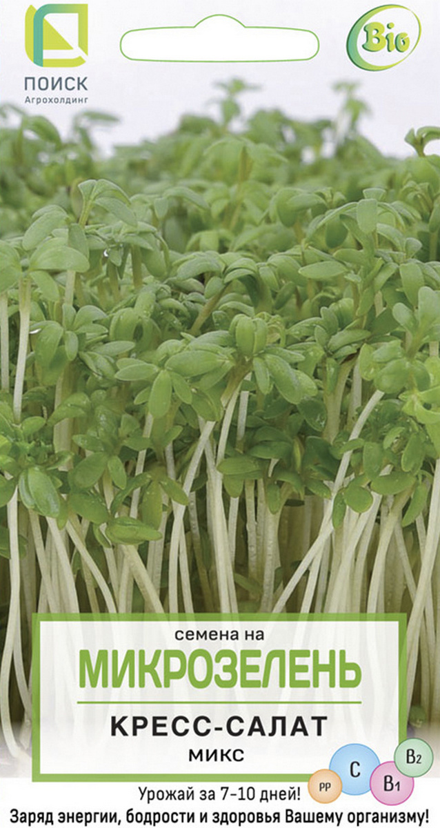 Микрозелень – это молодые растения в фазе семядольных или первых настоящих листьев. Пищевая ценность таких растений значительно выше, чем взрослых. Микрозелень содержит максимальное количество полезных витаминов, макро- и микроэлементов. Готова к срезке и употреблению на 8-10-й день после посева. Растения неприхотливые, быстрорастущие. Микрозелень используют только в свежем виде, не подвергая термической обработке. Добавляйте зелень в салаты, супы, на бутерброды. Бодрящий, острый вкус и легкий аромат хрустящего кресс- салата придаст пикантную ноту привычным блюдам. Состав: кресс-салат Крупнолистовой. В качестве субстрата для выращивания используют питательный грунт. Семена равномерно распределяют по уплотненной поверхности без присыпания. Грунт и семена проливают раствором перекиси водорода (6 мл на 1 л воды). Накрывают для сохранения увлажнения. Посевы проводят круглогодично.