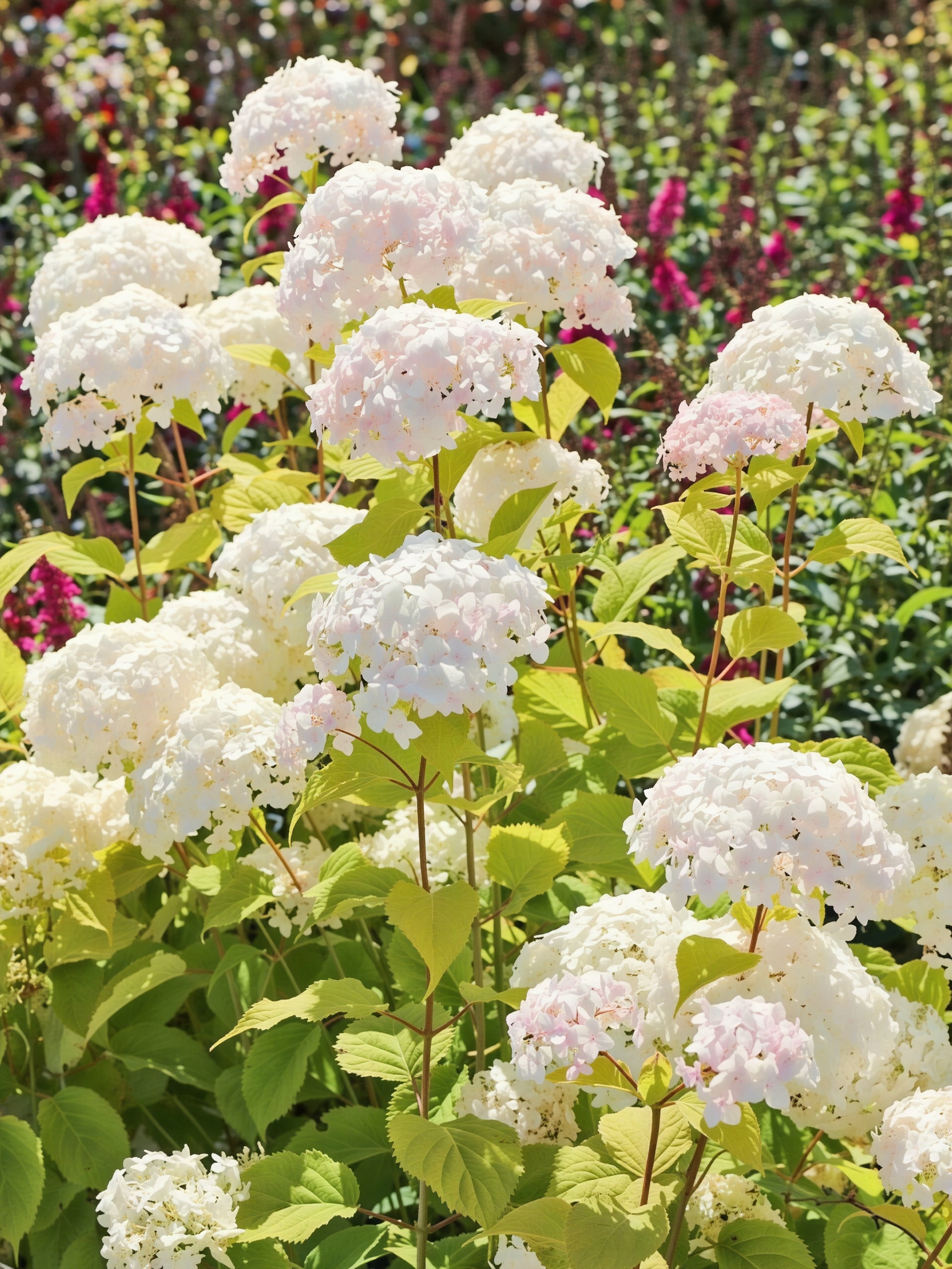 Гортензия метельчатая Фантом (Hydrangea paniculata Phantom) - это один из самых впечатляющих и популярных сортов. Он известен своими огромными конусовидными соцветиями и крепкими побегами, которые надёжно удерживают их вес. Размер достигает в высоту 2–2,5 метра и примерно такой же ширины. Соцветия очень крупные, плотные, конической формы, могут достигать 30–40 см в длину. В начале цветения кремово-белые, затем постепенно розовеют, а к осени могут приобрести насыщенный розовый оттенок. Отдельные цветки стерильные, имеют диаметр около 5–6 см. Обильное и продолжительное цветение с июля до октября. Считается устойчивым к основным заболеваниям и вредителям. Отлично подходит в качестве акцентного (солитерного) растения, можно использовать для создания живой изгороди, прекрасно смотрится в смешанных цветниках и миксбордерах, соцветия подходят для срезки и создания сухих букетов.