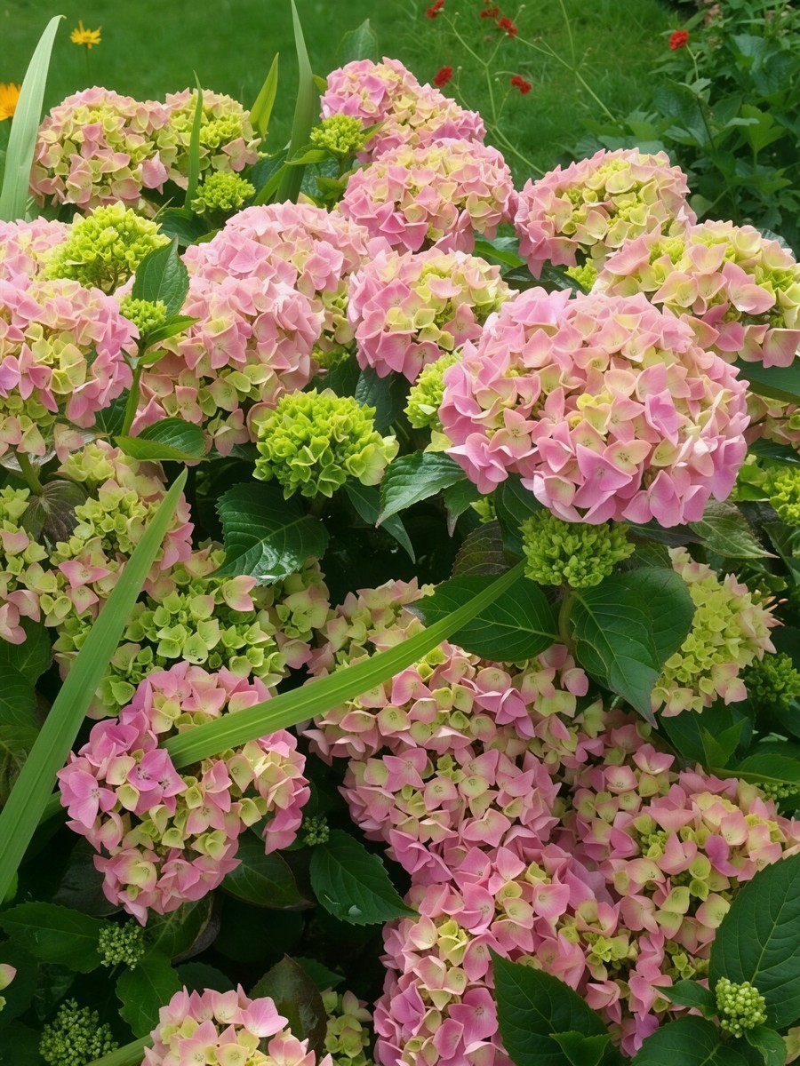 Со лонг Санни (So Long Sunny) – так называется сорт гортензии, выведенный в Японии Ясухиро Такахаши. Относится к крупнолистовым видам, используется как живая изгородь, в одиночных и групповых посадках, в срезке, для выращивания в контейнерах. Это низкорослый кустарник, компактный, высотой около метра, максимум – дорастает до полутора метров. В диаметре – 150 см. У него очаровательная шарообразная крона, продолговатые листочки, ярко-зеленые листья. Это декоративный кустарник со сферическими соцветиями, крупными, до 15 см в диаметре. Соцветия розовые, с темной каймой по краям, в процессе цветения на них появляются желтые и салатовые оттенки. Но основным окрасом считается розовый. Соцветия плотные, лепестки закрученные и изрезанные по краям. Так как соцветия, радующие доминирующим розовым, выглядят практически как пушистые облака, этот визуальный эффект и нужно использовать в садовом дизайне. Расти сорт может и на солнце, и в полутени.