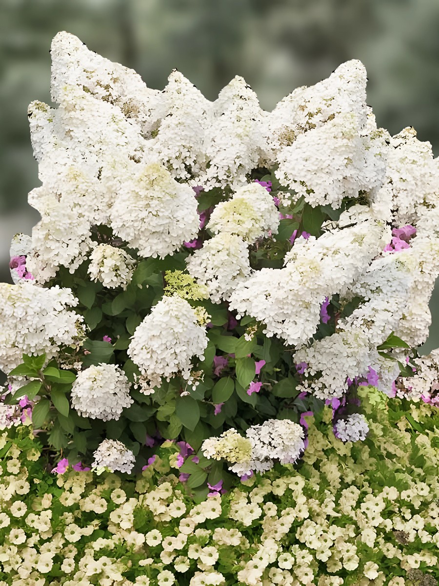 Гортензия метельчатая Фантом (Hydrangea paniculata Phantom) - это один из самых впечатляющих и популярных сортов. Он известен своими огромными конусовидными соцветиями и крепкими побегами, которые надёжно удерживают их вес. Размер достигает в высоту 2–2,5 метра и примерно такой же ширины. Соцветия очень крупные, плотные, конической формы, могут достигать 30–40 см в длину. В начале цветения кремово-белые, затем постепенно розовеют, а к осени могут приобрести насыщенный розовый оттенок. Отдельные цветки стерильные, имеют диаметр около 5–6 см. Обильное и продолжительное цветение с июля до октября. Считается устойчивым к основным заболеваниям и вредителям. Отлично подходит в качестве акцентного (солитерного) растения, можно использовать для создания живой изгороди, прекрасно смотрится в смешанных цветниках и миксбордерах, соцветия подходят для срезки и создания сухих букетов.
