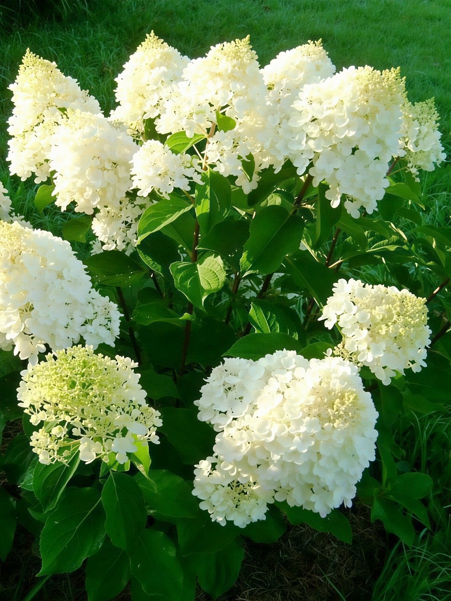 Гортензия метельчатая Грандифлора (Hydrangea paniculata Grandiflora) старинный сорт, который известен еще с 1860 года и прославившийся своей неприхотливостью и умением выдерживать сильные морозы. Сорт родом из Восточной Азии, где в природных условиях она достигает 10 метров в высоту. В наших условиях гортензия Грандифлора достигает 2 м в высоту и столько же в диаметре. Побеги прямостоячие, но под тяжестью соцветий поникают к земле. Листья матово-зеленые, шершавые. Цветки конусовидные, при распускании кремово-белые, в полном цветении чисто-белые, затем розовые, осенью — зеленовато-красные. Цветет Грандифлора с июля по сентябрь. Этот кустарник можно использовать для украшения парков, можно выращивать в качестве живой изгороди, размещая в городской зоне вдоль автомобильной трассы. Используется для одиночных и групповых посадок, смешанных с многолетниками.Хороша гортензия и для зимних букетов.