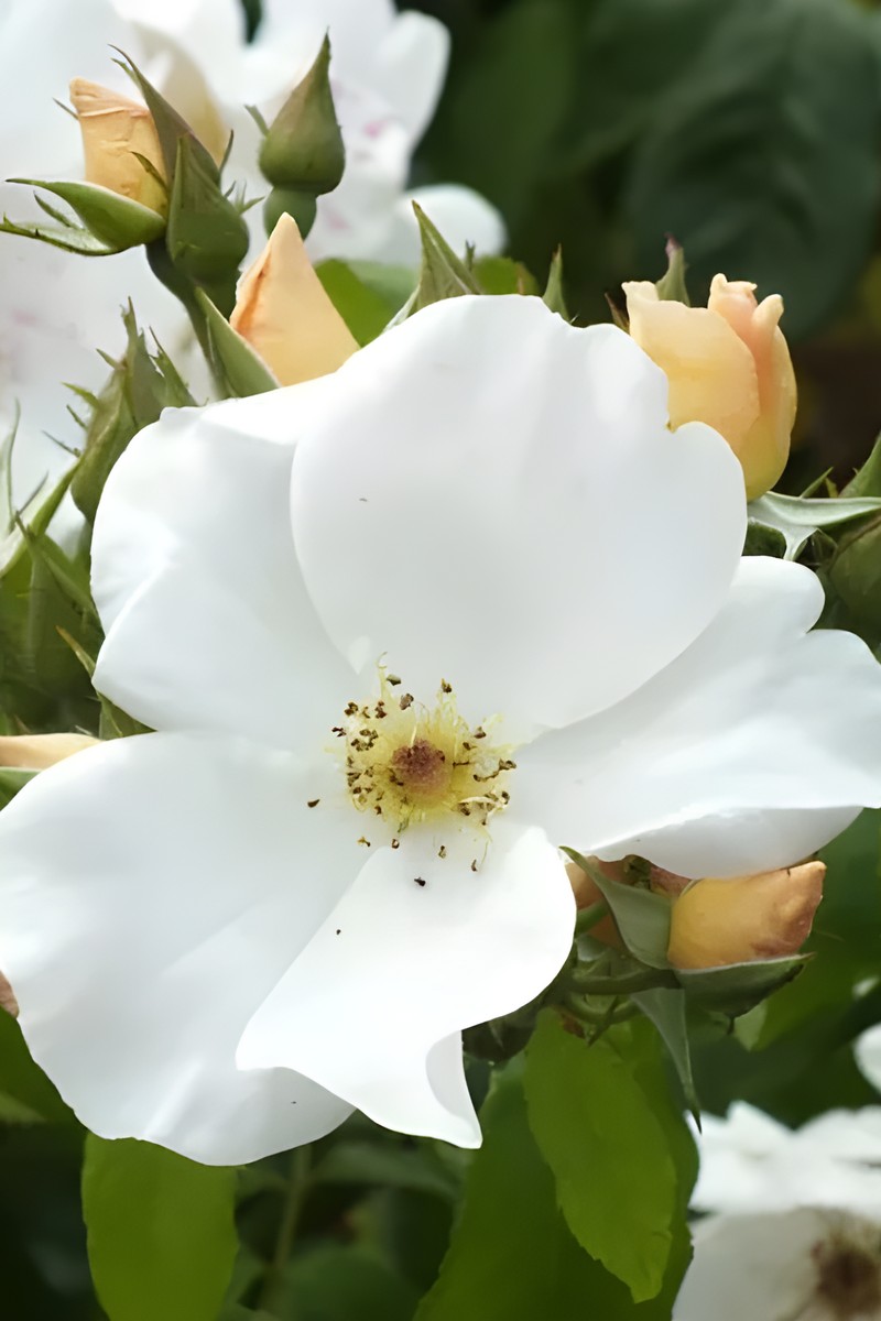 Роза Салли Холмс (Sally Holmes) – сорт появился в 1976 году в Великобритании. Над его получением работал учёный Роберт Холмс, который назвал розу в честь своей жены Салли. Гибрид стал результатом экспериментов по скрещиванию двух сортов – Ivory Fashion и Ballerina. Кустарник имеет отличное разветвление и длинные прямостоячие побеги. Крупным листьям свойственна блестящая поверхность и насыщенный зелёный цвет. Шипы у растения есть, но их крайне мало. Цветы объединены в огромные соцветия, в каждом из которых можно насчитать от 10 до 40 роз. Расцветка бутонов – светло-кремовая с абрикосовым оттенком. Раскрывшаяся роза – кремово-белая, с объёмными золотистыми тычинками в середине. Кустарник источает едва уловимый, пряный, сладостный аромат, близкий к запаху мускуса, в нём можно прочесть нотки цветочного мёда, гвоздики, фруктов, орриса. Цвести английский гибрид начинает в июньский период и с маленькими промежутками цветёт вплоть до начала осенних заморозков.