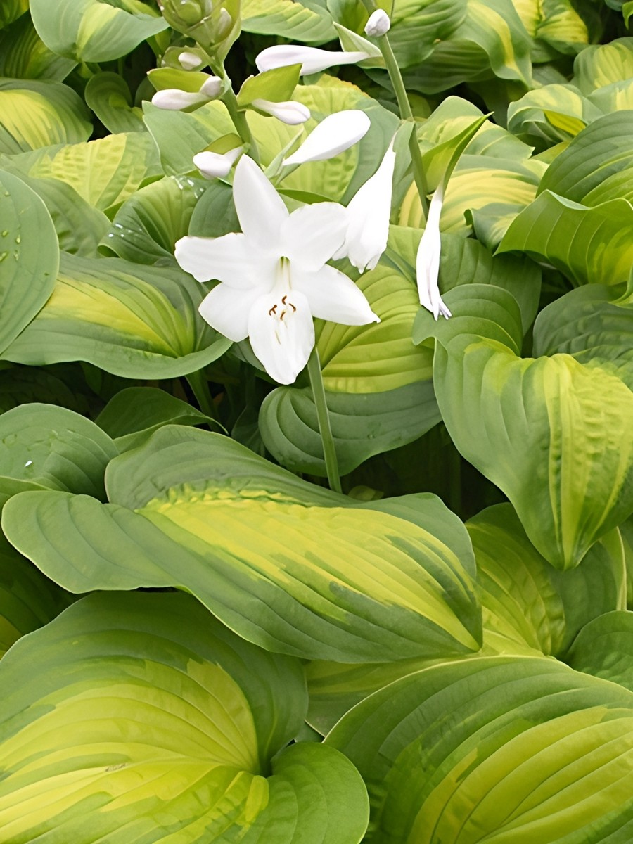 Хоста Шарман – крупный сорт с необычайно декоративными яркими листьями! Центральная их часть насыщенно жёлтого цвета с салатовым оттенком, а крайняя обводка резко переходит в глянцевую зеленую окраску. Высота хосты 60 см. При этом листья имеют не столь крупные габариты: 12 см-16 см. Чем более яркое место для посадки вы ему выберете – тем насыщеннее будет его окраска. Цветение с июля по август белыми цветами!