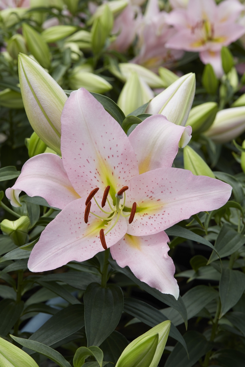 Лилия азиатская Марлен это один из самых удивительных представителей многоцветковых гибридов, получен в результате скрещивания азиатских лилий и лонгфлориумов. Высота растения достигает 90-100 см, что делает его отличным выбором для создания ярких композиций. Особенностью лилии является ее необычное цветение. На каждом цветоносе огромное количество бутонов, до 100 шт. Эта особенность сорта делает его невероятно популярным среди садоводов. Причина - необычная мутация, в результате которой несколько стеблей срастаются вместе с главным побегом, это может происходить уже на второй год. Цветки направлены вверх и в стороны, диаметром до 18 см. Окраска лепестков красивого розового цвета. Аромат тонкий, выражен не ярко. Лилия цветет в июне-июле. Лилия Марлен неприхотлива, отличается хорошей морозостойкостью, быстро и легко размножается, хорошо приспосабливается к неблагоприятным условиям. Лучше всего растет на нейтральных или слабокислых и хорошо удобренных почвах.