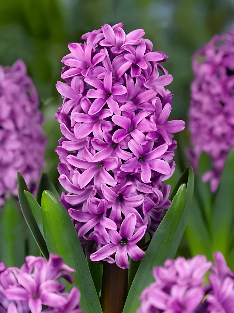 Гиацинт Мисс Сайгон - сорт вида восточный, отличается высокой декоративностью и привлекательным внешним видом. Он выделяется красивоцветущими цветками и обильными зелеными листьями, придающими ему особый шарм. Соцветия Мисс Сайгон крупные, шаровидные. Цвет невероятно сказочный, неоново-фиолетовый с перламутровым блеском. По центру каждого лепестка проходит более тёмная полоса, которая привносит разнообразие и не делает гиацинт скучным и однотонным. При этом внешняя сторона лепестков – тёмно-фиолетового цвета. Несмотря на то, что цвет его очень насыщенный, в весенних посадках он смотрится исключительно органично. Высота растения 25 см, обладает прочным стеблем, что делает его устойчивым к неблагоприятным погодным условиям. Соцветия крупные и махровые, 15–20 см. Аромат стойкий, сохраняется на протяжении всего периода цветения. Период цветения начинается в апреле и продолжается в среднем 2–3 недели. Подходит для оформления весенних цветников благодаря яркой расцветке и аромату, а также для выгонки и срезки.