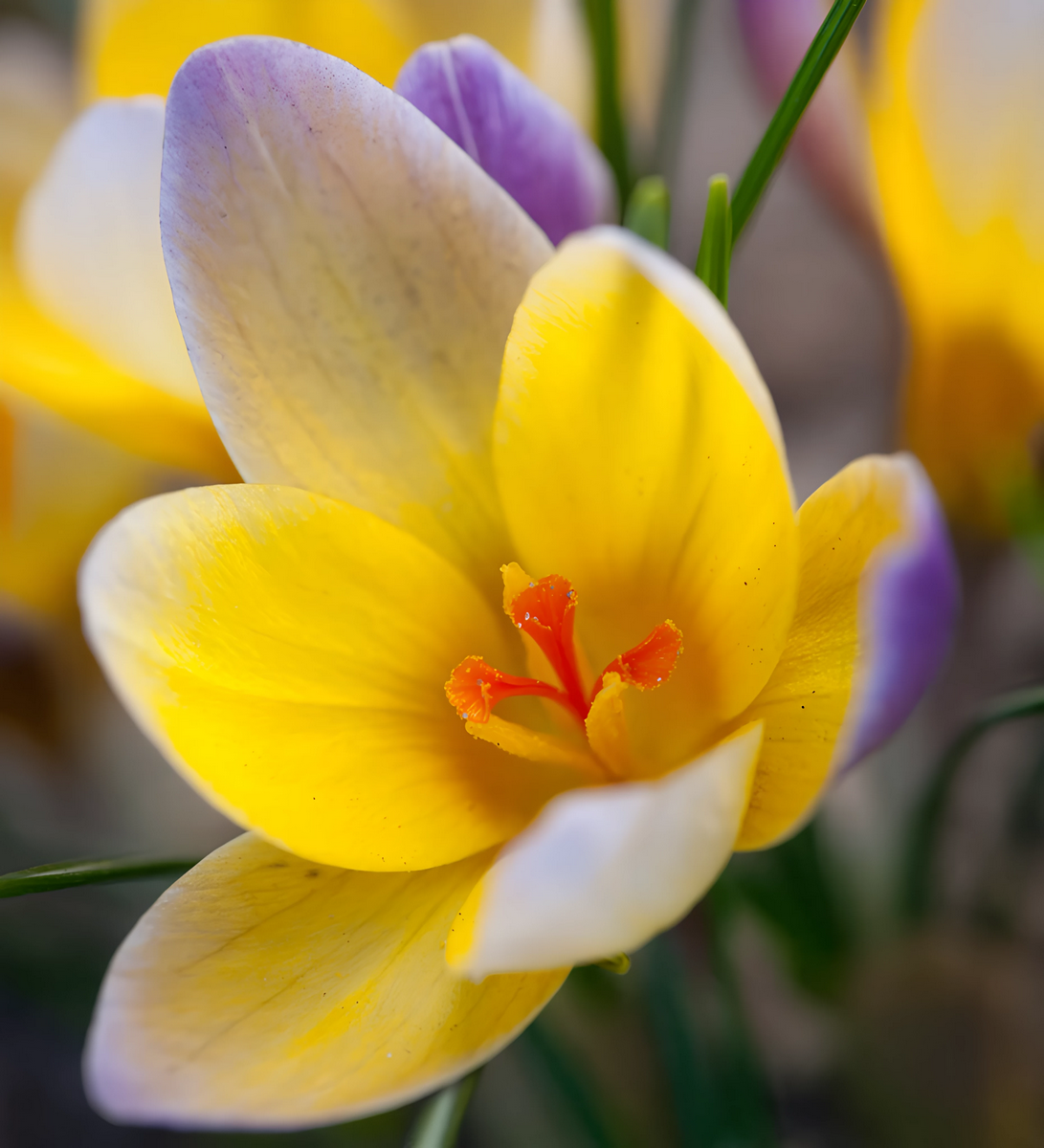 Крокус ботанический Адванс - многолетнее луковичное растение, относится к группе мелкоцветковых ботанических. Сорт получен селекционерами при скрещивании крокуса золотистого. Шестилепестковые цветы данного сорта имеют бокаловидную или чашевидную форму и направлены строго вверх. Многочисленные фиолетовые бутоны раскрываются в золотисто-желтые чашевидные цветки, с приятным ароматом и яркими оранжевыми тычинками, диаметром 3-3,5 см. Это светолюбивые, но устойчивые к легкому затенению растения. Высота взрослого растения до 10 см. Крокусы предпочитают расти на легкой, рыхлой и плодородной почве. Если почва глинистая, то следует добавить в нее немного песка. Перед посадкой грунт желательно удобрить перепревшим навозом или компостом, а затем хорошо вскопать. Период цветения - ранняя весна, февраль – март. Зимостойкость у сорта высокая, зимует без укрытия. Адванс станет прекрасным украшением альпийской горки и клумбы, отлично подойдет для ландшафтной посадки, активно используется для озеленения вдоль садовых дорожек.