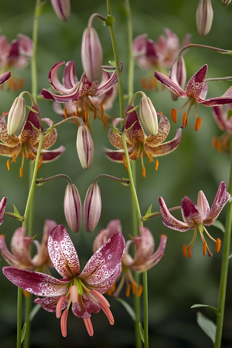 Лилия Альберта Морнинг кудреватая это самая морозостойкая группа, ведь их исходный вид — лилия мартагон — встречается даже в суровом сибирском климате. Ареал ее простирается практически по всей Евразии и до самого Дальнего Востока. Такое широкое распространение этого вида говорит о его необычайной выносливости и абсолютной неприхотливости. Мартагон-гибриды декоративны, отличаются разнообразной окраской, многоцветковостью (от 30 до 50 цветков), сладким ароматом и изяществом формы цветков, похожей на чалму (турецкий головной убор). Растения, как правило мощные, обладают устойчивостью к грибным и вирусным болезням и долговечностью луковицы (до 30 и более лет). Куст у лилии Альберта Морнинг может достигать 120 см. Цветки не крупные диаметром до 7 см. Цвет лепестков розовый с темно-вишневыми штрихами. Цветение продолжается с июля по август