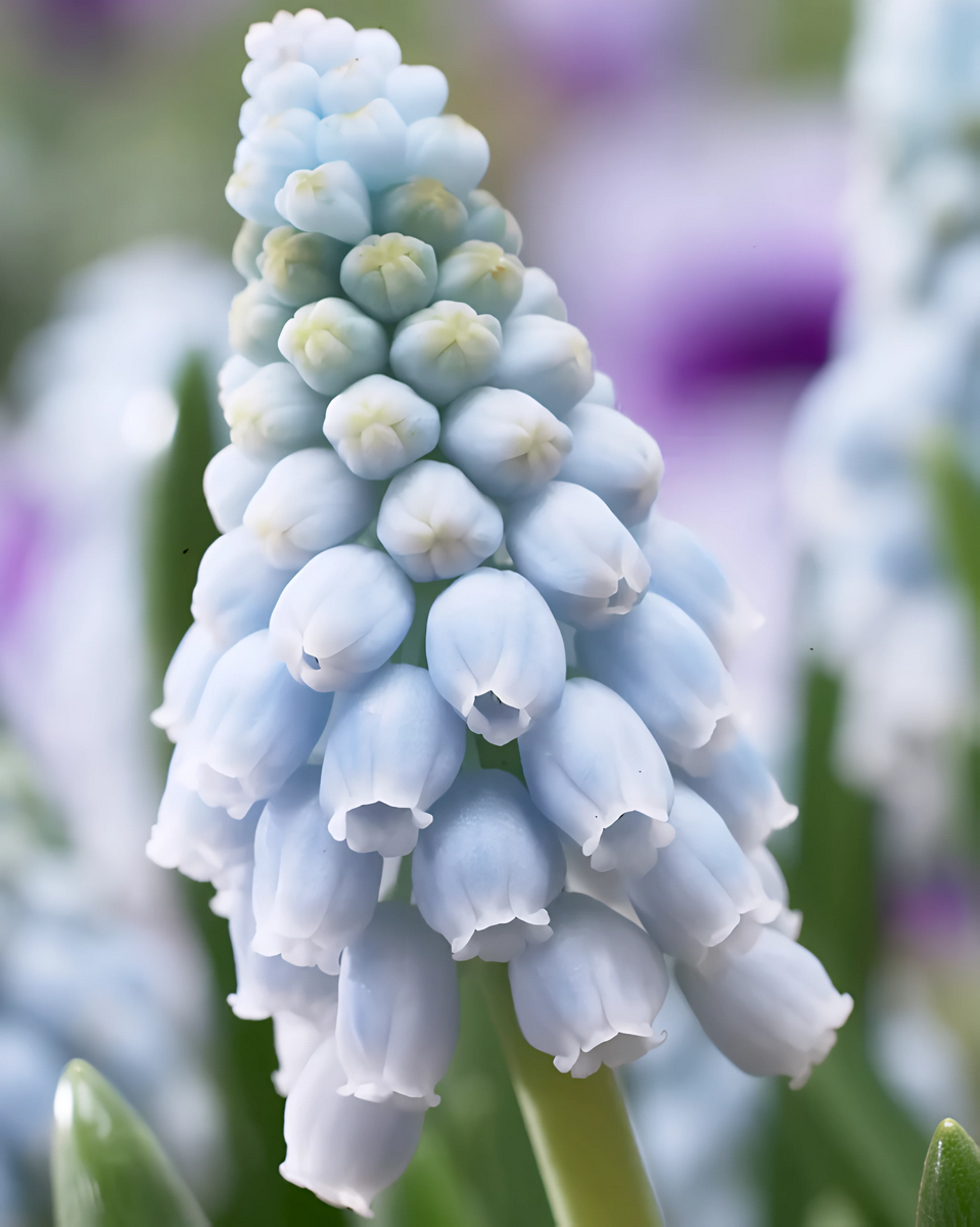 Мускари Валери Финнис - многолетнее луковичное растение. Жемчужно-голубой цвет мускари Валери Финнис придаёт клумбе светской роскоши. Выровненные цветки диаметром до 1 см словно бубенцы, звенящие на погремушке, плотно заполняют вершину стебля. Главным украшением этого цветка, помимо цвета, является яркий аромат. Зацветает позже других сортов, данный факт позволить продлить цветение Вашей весенней клумбы. Высота растения 15–20 см. Соцветие в виде бочонка, сужающегося кверху, состоит из большого количества мелких голубых цветков, на макушке - бесплодных. Весной сначала отрастают узко-линейные листья (3–5 шт.), объединённые в прикорневую розетку, а потом выходит безлистный цветонос с зелёными бутонами. Распускаются цветки: снизу вверх. Период цветения март-май. Во время цветения требуется влажная почва, в покое, наоборот, влага луковицам не нужна. Лучше всего культура растет на открытых солнечных участках. Используются в посадках на газонах, рабатках, бордюрах и альпинариях, пригодны для выгонки.