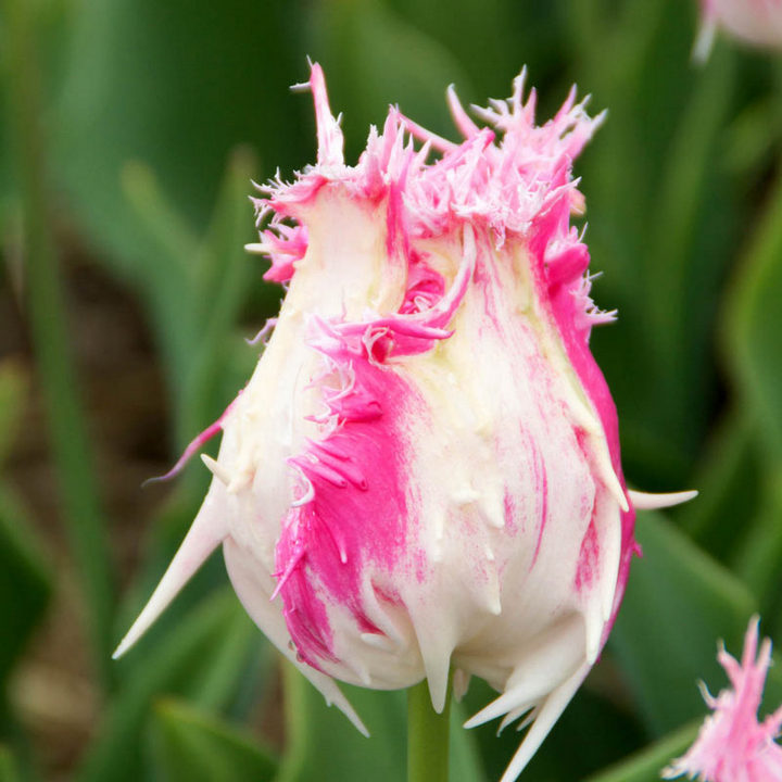 Тюльпан бахромчатый Дракенштейн - сорт с глубоко зубчатыми цветками. Многочисленная бахрома располагается не только на кончиках лепестков, она покрывает весь цветок целиком. Окрас: сочетание пастельного розового с насыщенным, практически фуксией. Высота взрослого растения около 45–50 см. Диаметр раскрытого бутона 9–11 см. Красиво смотрится в бордюрных посадках вместе с другими раннецветущими многолетниками, а также в сочетании с тюльпанами других сортов. Эффектен в срезке.