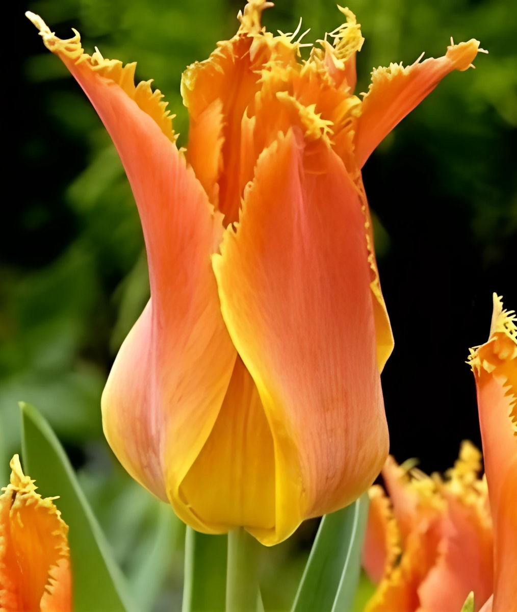 Тюльпан Александра - лилиецветный бахромчатый сорт тюльпанов. Окраска жёлто-оранжевая, градиентно окрашивающая лепестки. Лепестки обладают слегка колючей подпушью, край лепестков напоминает лёгкую бахрому. Бахромчатые тюльпаны считаются самыми загадочными и у всех без исключения вызывают восхищенное внимание. Их изюминка – это бахрома из разноразмерных, хаотично направленных выростов игольчатой формы, напоминающих узоры из кристаллов инея. Невероятное сочетание, которое смотрится сверх экзотично в садах! Высота достигает 50 см. Период цветения апрель - май. Диаметр цветка от 4 см до 5 см. Аромат у сорта слабый. Тюльпаны Александра подходят в основном для умеренного климата, в тропиках приживаются неохотно, так как температура свыше +32 °C угнетает эти растения: лепестки начинают выгорать. Морозостойкость до –40 °C. Сорт предназначен для групповых посадок, может выращиваться как отдельно стоящий цветок, подходит для срезки.