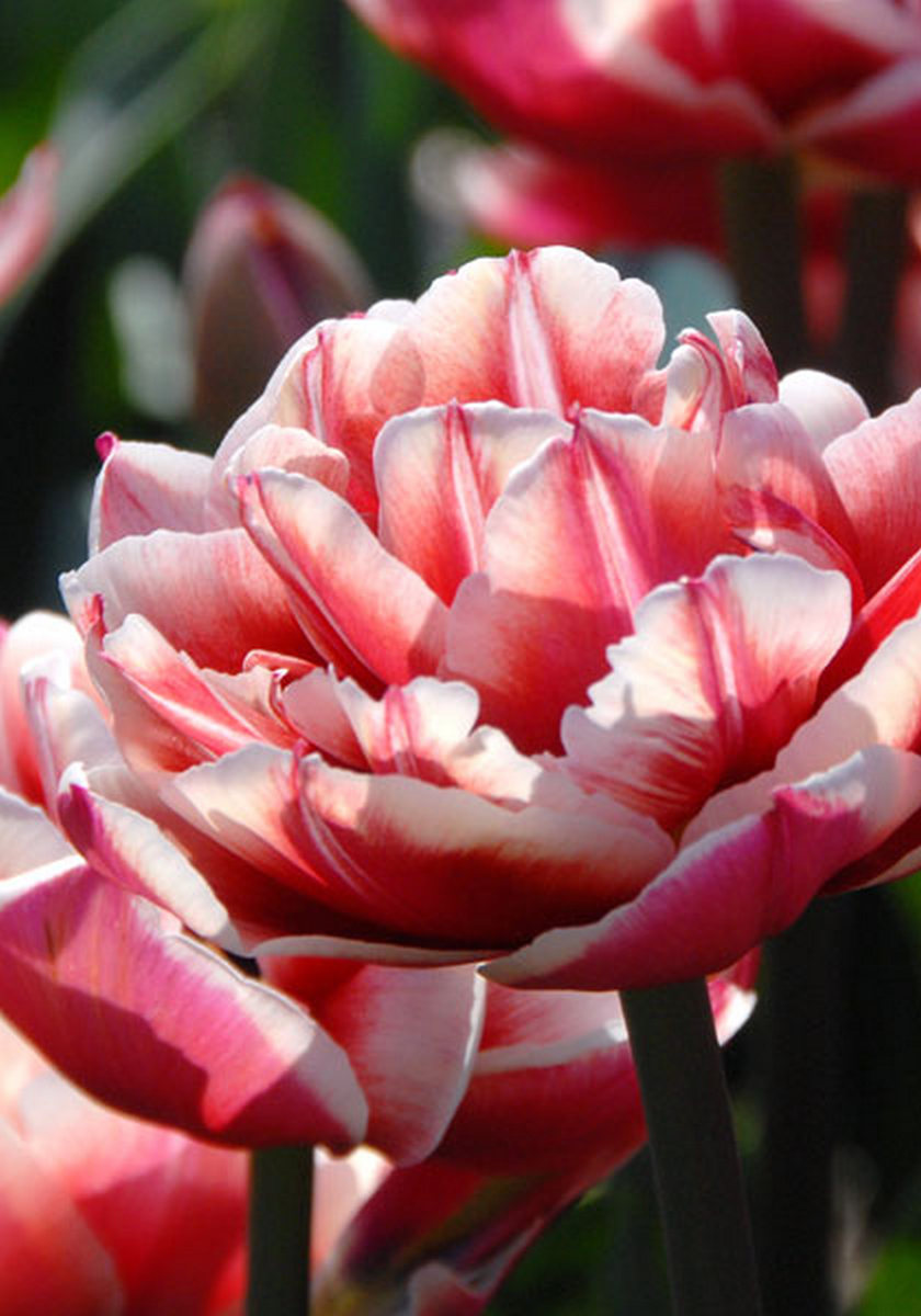 Тюльпан махровый поздний Гербранд Кифт - пионовидный сорт тюльпана. Крупные, махровые цветки розового цвета с чётко выраженным белым ровным краем лепестков. Бутоны напоминают изысканные пионы. Высота растения 40 см, диаметр 10-12 см. Подходит для выращивания на клумбах, рабатках, бордюрах, для срезки, контейнерное выращивание. Преимущества сорта: устойчивость к болезням, длительное цветение, эффектный внешний вид. Цветы используются при создании букетов и оформлении клумб.