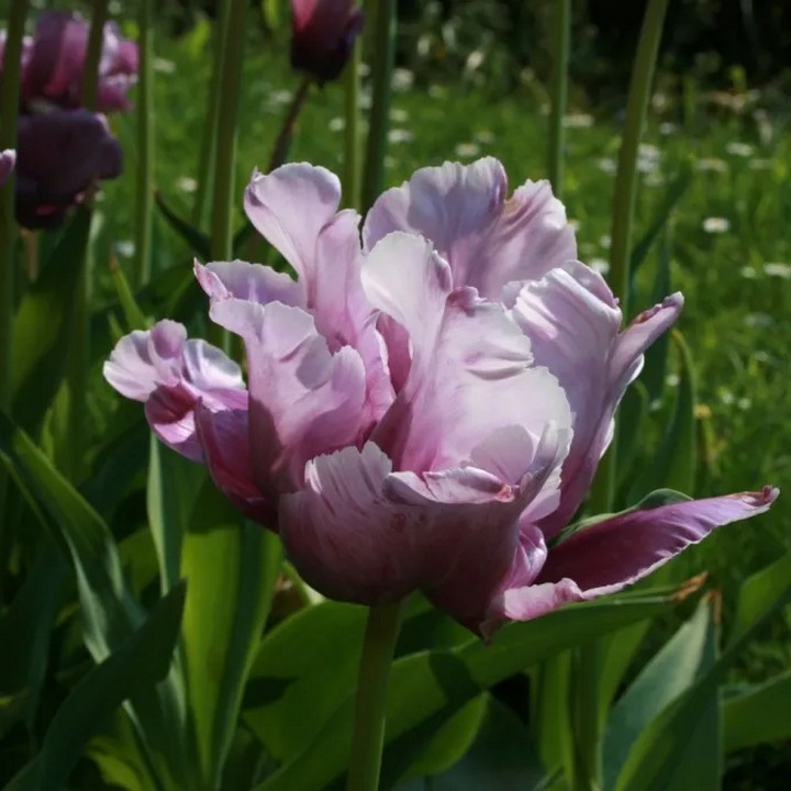 Тюльпан попугайный Блу Пэррот — экзотический сорт, который цветёт в конце мая. Цветок светло-сиреневый с голубоватым отливом, фиолетовыми и бронзовыми отблесками. Внутренняя поверхность лепестка окрашена в тёмно-сиреневый цвет с бронзовыми вкраплениями. Форма цветка чашевидная в диаметре 15–20 см. Высота растения до 50 см. Цветки с крылатыми, слегка рассечёнными и словно гофрированными лепестками, напоминающими яркое оперение тропической птицы, в честь которой попугайные тюльпаны и получили своё название. Подходит для озеленения и украшения клумб, а также для букетов. Луковицы садовых тюльпанов нужно выкапывать каждый год. Место посадки тюльпанов лучше менять 1 раз в 4-5 лет.