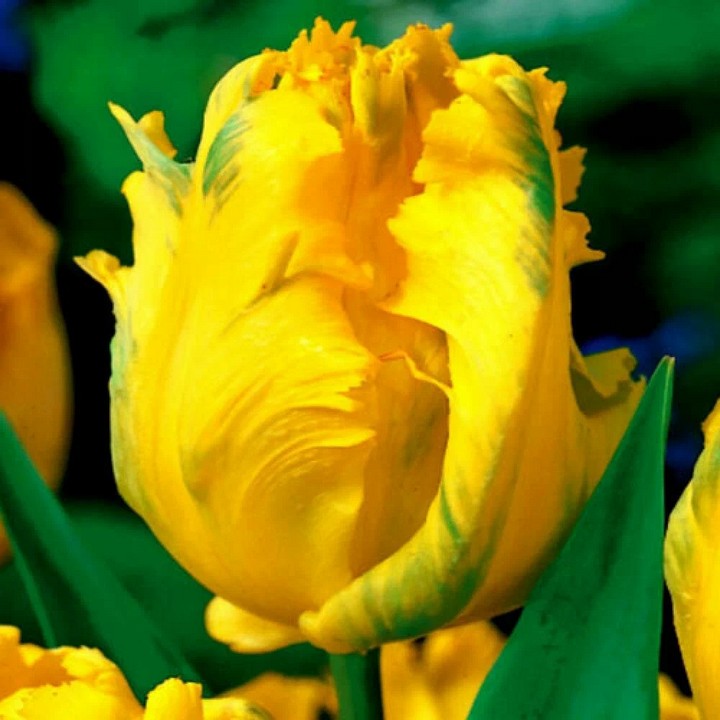 Ян Ван Нес Пэррот - попугайный тюльпан. Цветки насыщенно жёлтые с изумрудной прожилкой и штрихами по лепестку, похожи на перья яркой птицы. Форма цветка необычная: лепестки жатые, слегка закрученные винтом, с неровным краем. Бутоны тяжёлые, в период дождей и ветров им нужна подвязка. Высота растения 45 см. Сорт универсального назначения, подходит для срезки.