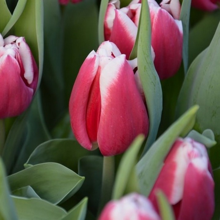 Тюльпан Генуя простой ранний - популярный класс тюльпанов, отличается наиболее ранним цветением цветки средних размеров чашевидной формы. Бутон малиновый с белой каймой. Невысокие цветоносы, 25-40 см, крепкие и прочные, которые не боятся дождя и ветра.. Идеально подойдёт для групповых посадок, а также для срезки.