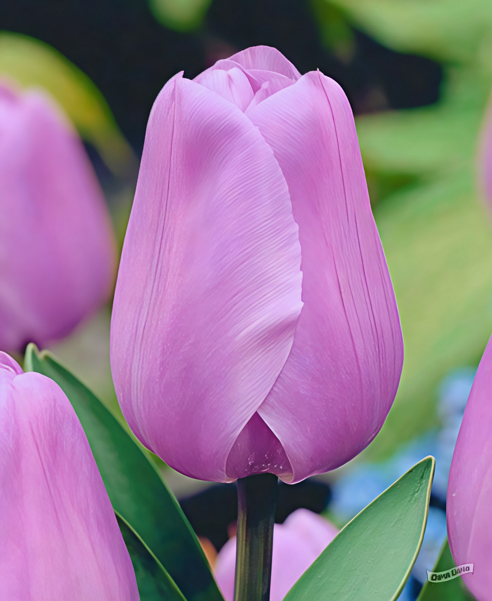 Тюльпан Алиби - сорт тюльпанов класса «Триумф», выведенный в Голландии. Высота цветоносов 40–60 см. В благоприятных условиях может быть и выше. Листья плотные, остроконечные, светло-зелёные, образуют розетку вокруг стеблей с бутонами. Стебли плотные, светло-зелёные, растут вертикально, удобны для срезки. Цветение начинается в мае, когда устанавливается температура воздуха 17–20 °C, и длится до конца мая или иногда дольше. Бутоны бокаловидной формы, высота - около 7-8 см, лепестки гладкие, маслянистые, сиреневые, сердцевина бледно-жёлтая. Аромат тюльпаны источают приятный нежный аромат. Почва необходима плодородная, хорошо дренированная, лёгкая, богатая перегноем, с нейтральной кислотностью. Тюльпаны не переносят застои влаги. В ландшафтном дизайне цветы используют при оформлении бордюрных зон, цветников, парковых зон и приусадебных участков. Подходят как для одиночных, так и для групповых посадок.