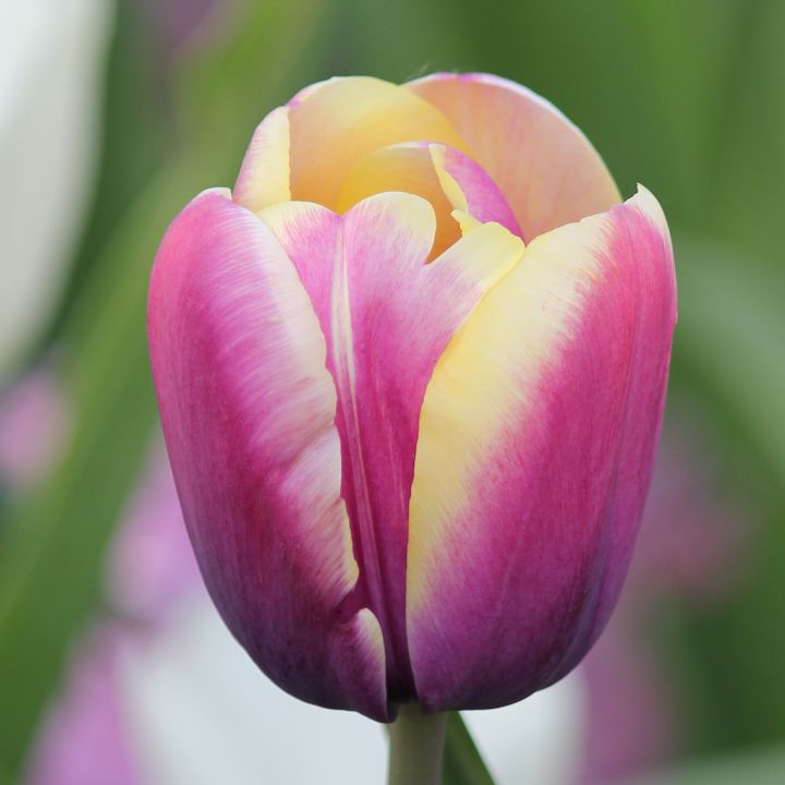 Тюльпан Триумф Арабиан Бьюти - раннецветущий декоративный сорт. Бокаловидные фиолетово-розовые цветки с яркими жёлтыми штрихами по краям создают настоящий драматический сюжет. На низкорастущем кустике (до 40 см) вырастают бутоны средних размеров (6–8 см). Раскрываясь, они поражают необычным тёмно-сиреневым окрасом с яркой жёлтой, будто световой, каймой. Сорт великолепно сохраняет форму бокала в течение всего продолжительного цветения. Тюльпаны имеют отличный иммунитет и универсальное назначение. Период цветения апрель-май. Растение морозостойкое и не требует особого ухода. Рекомендуется поливать его умеренно и обеспечивать достаточное освещение. В букетах будет прекрасно солировать наряду с белоснежными сортами, но и заиграет новыми драгоценными оттенками с другими разноцветными тюльпанами. Луковицы садовых тюльпанов рекомендуется выкапывать каждый год. Место посадки тюльпанов лучше менять 1 раз в 4-5 лет.