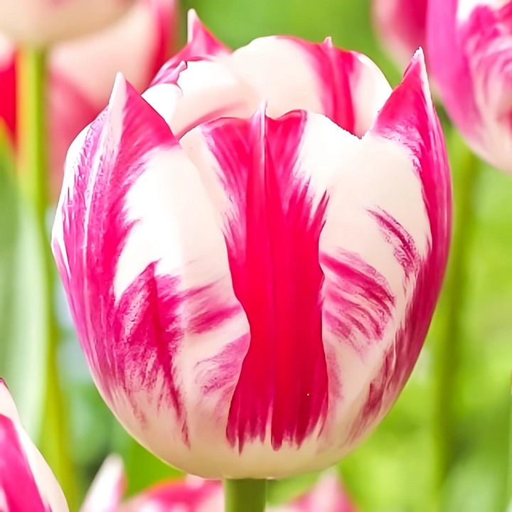 Тюльпан Триумф Ди Ди - сорт тюльпанов вида «Триумф». Высота растения 45 см. Лепестки атласные, чуть перистые, окрашены в чистый белый цвет с пестрыми, акварельными ало-розовыми штрихами и мазками. Этот живой рисунок делает каждое соцветие уникальным. Цветок бокаловидной формы, высотой до 10 см. Диаметр 10-12 см. Листва зелёная, ланцетовидная. Сроки цветения - середина весны (апрель-май). Для посадки нужен солнечный участок или лёгкая полутень. Зимостойкость в средней полосе - высокая. Почва должна быть плодородная, хорошо дренированная, слегка щелочная. Устойчив к прохладе и дождю. Идеален для срезки и нарядных композиций. Применяется на клумбах, бордюры, для срезки и контейнерного выращивания.