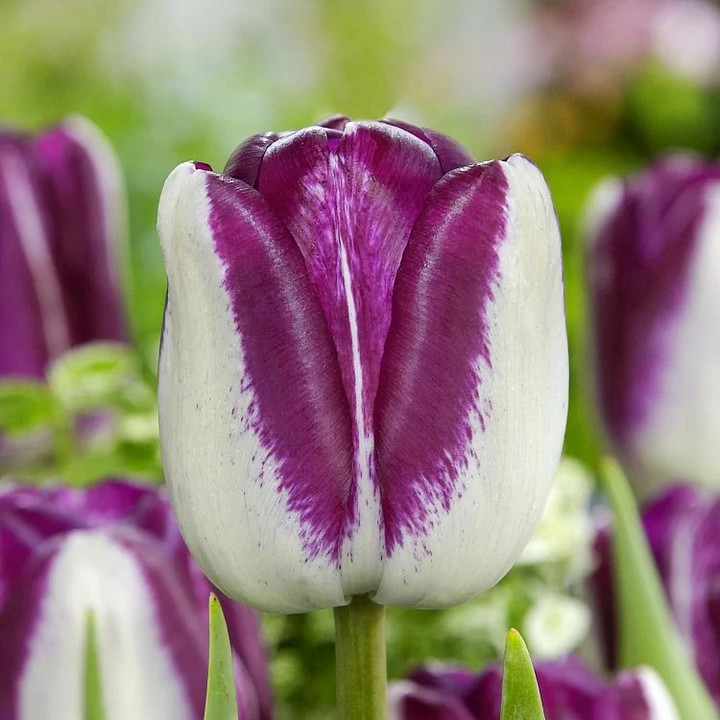 Тюльпан Амстердам - сорт среднего срока цветения из класса тюльпанов «Триумф». Высота стеблей до 50 см. Форма цветка бокаловидная. Лепестки простые, глянцевые. Окраска бело-вишневая, аромат приятный. Бутоны распускаются в мае, когда дневная температура воздуха установится на отметке 18 °C. Продолжительность цветения достигает трёх недель. Крупные бутоны до 10 дней сохраняют окраску и свежесть. Можно высаживать как на открытом солнце, так и в частично затенённых местах. Растению требуется обогащённая органикой почва нейтральной реакции, умеренный полив, внесение подкормок. Подкормки вносят два раза в течение сезона: сразу после таяния снега и при формировании бутонов. Характеризуется декоративностью и неприхотливостью, цветы используют в ландшафтном дизайне и выращивают в промышленных масштабах на срез. Тюльпан Амстердам универсален, используется для выгонки, для украшения парков и садов. Недостатком является слабая сопротивляемость вирусу пестролепестности.
