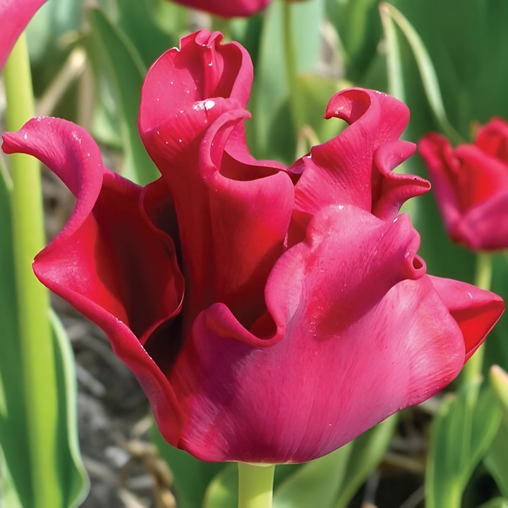 Тюльпан Триумф Ред Дресс - это совершенно эксклюзивный и необыкновенный сорт. Бутоны напоминают короны. Сорт создан голландскими селекционерами, относится к группе среднецветущих сортов класса «Триумф». Форма лепестков причудливо скрученные, маслянистые. Высота бокала 6 - 8 сантиметров. Каждый бутон возвышается над розеткой листьев на отдельном стебле. Период цветения апрель — май. Аромат тюльпаны данного сорта источают нежный цветочный аромат. Высота стеблей 35 сантиметров. Листья у тюльпанов этого сорта плотные, светло-зелёного оттенка, матовые, широколанцетные, растут из одной точки (луковицы). Растение характеризуется декоративностью, продолжительным периодом цветения и морозоустойчивостью. Тюльпан Ред Дресс подходит для оформления парковых зон, цветников, бордюров и приусадебных участков, а также для срезки. Место посадки тюльпанов лучше менять 1 раз в 4-5 лет.